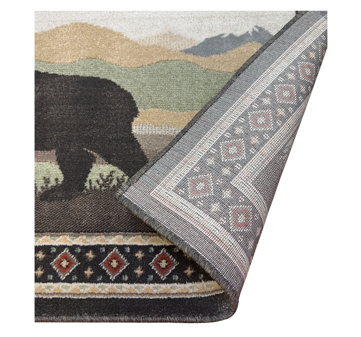 With a rustic forest motif and stylized border, this handsome Vista Curious Bear Rug is crafted of flame-resistant, 100% Olefin fibers, making it perfect for in front of your hearth. It's large 30" x 50" size protects a wide area. It's also a cozy addition to any den, cabin, family room and more! Ultra-durable, heavy-twist yarn is tough and colorfast to resist staining, making it ideal for high-traffic areas. Made in the USA.