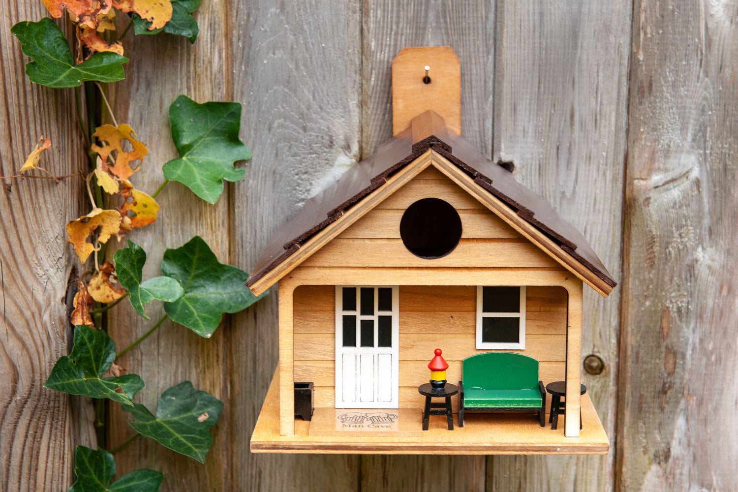 The Man Cave or manscape, is a retreat or sanctuary, a specially equipped escape space. The perfect gift for the birds and your favorite man. Sure, to give the birds and guy in your life lots of pleasure. Our “Man Cave” tiny house birdhouse has a decked-out front porch including details such as a comfy sofa, 2 stools, one with a faux lantern, a welcoming front mat, door and window details.