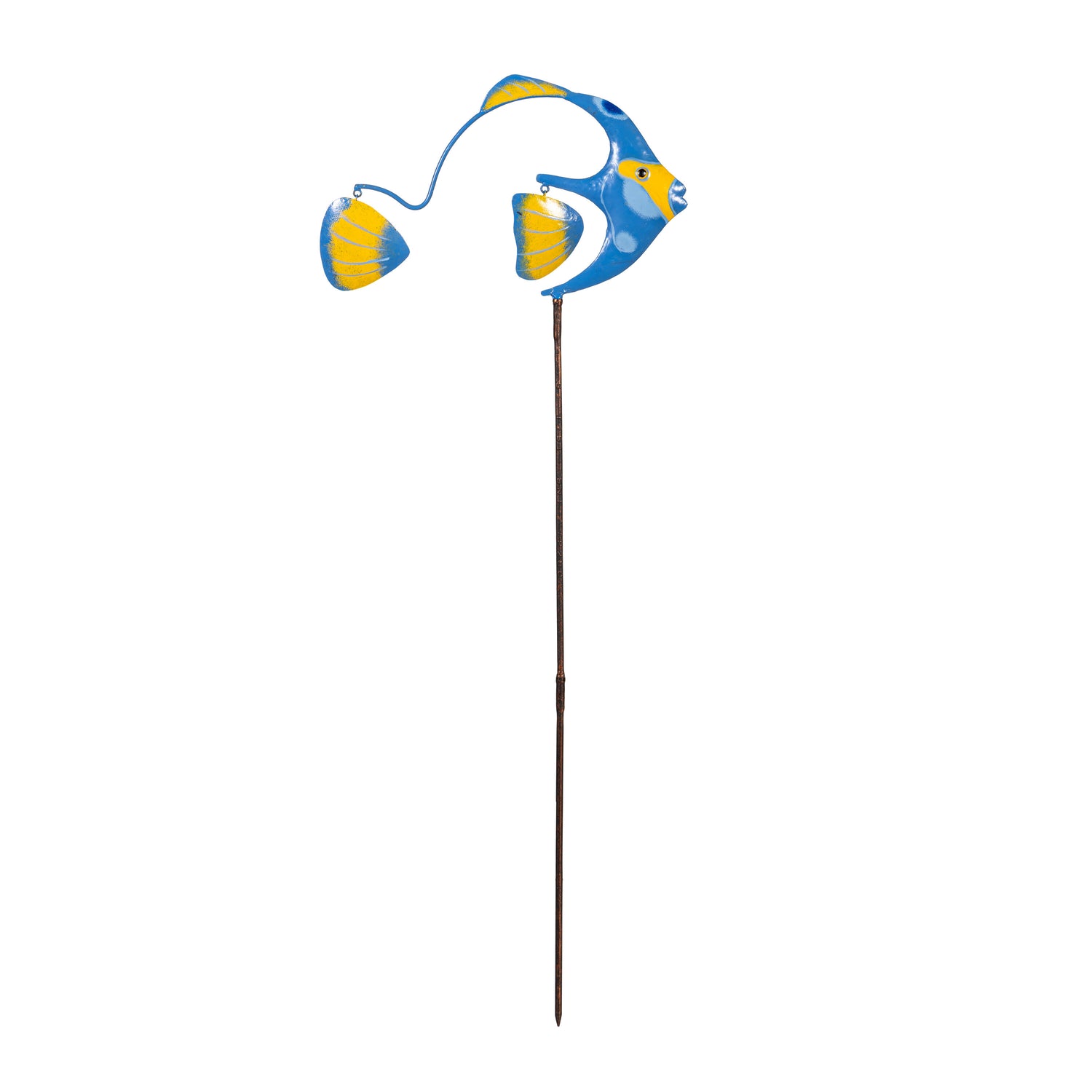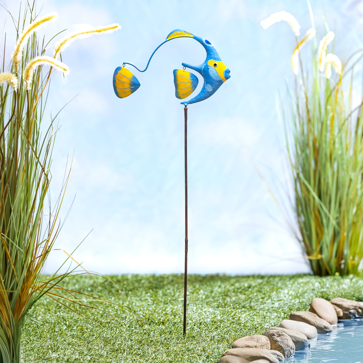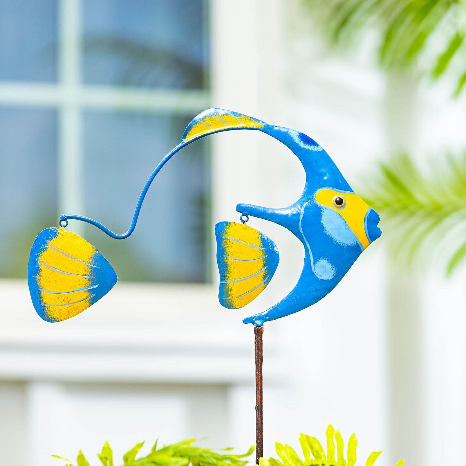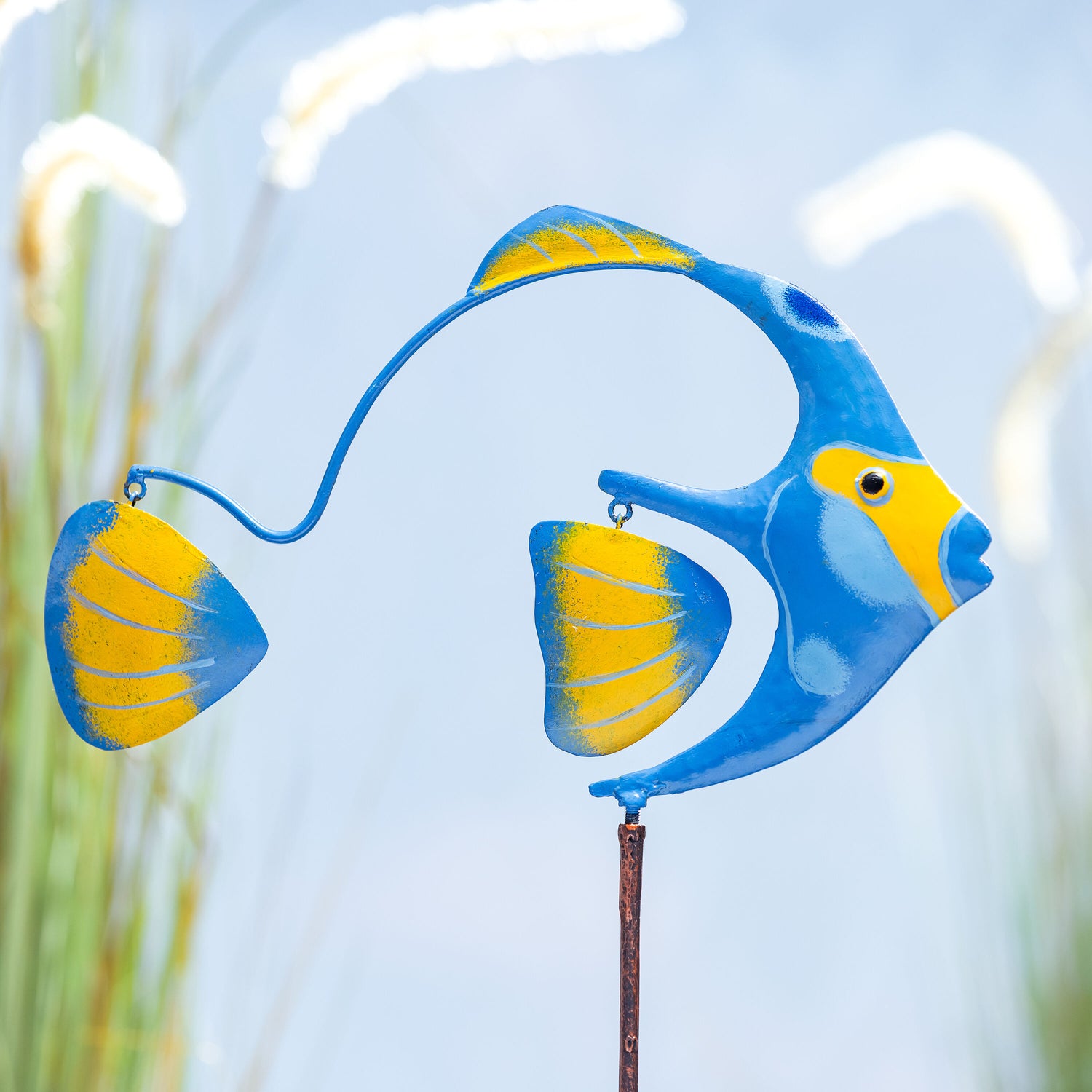 Crafted from durable recycled metal and hand-painted in brilliant hues of blues and yellows, this charming fish features gracefully curved fins that catch the breeze and dance with the wind. It’s a playful nod to waterside living and a perfect way to bring motion and joy to flowerbeds, pathways, or pots.