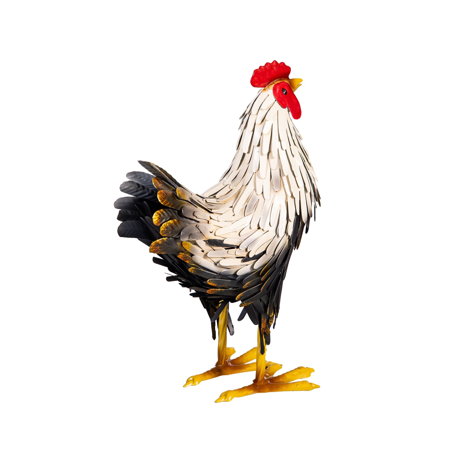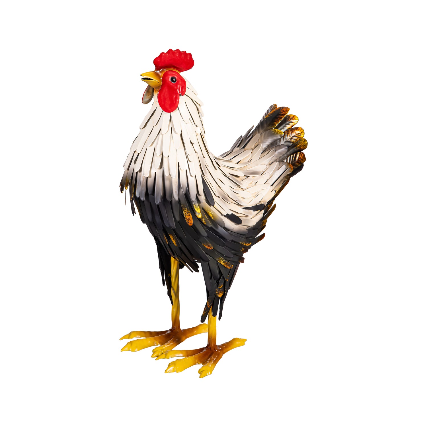 Petal & Plow Garden Statue, Metal Hen Garden Statue, Black and White Feathers, 14"H