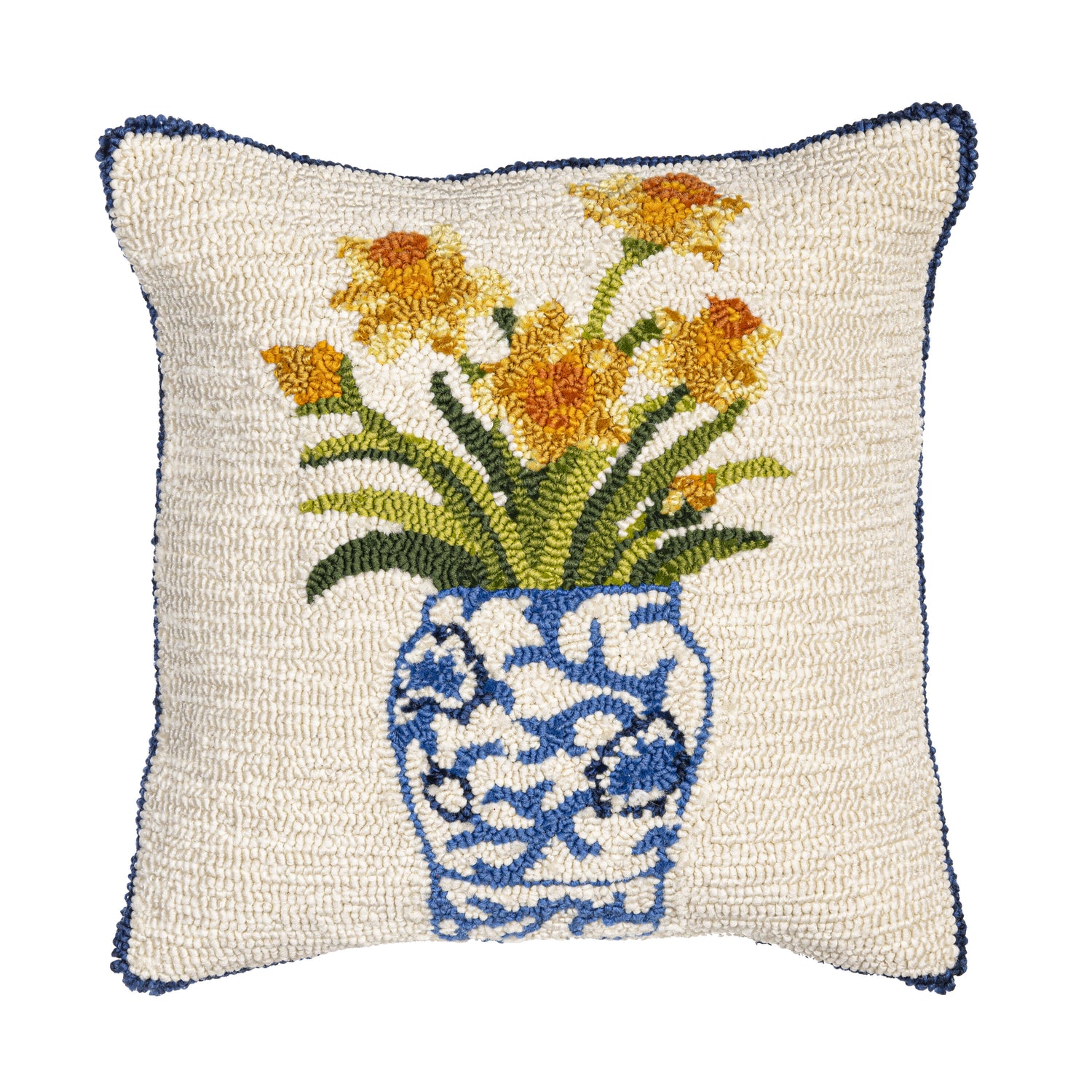 Chinoiserie Bloom Daffodil Indoor/Outdoor Hooked Pillow 18"x18"