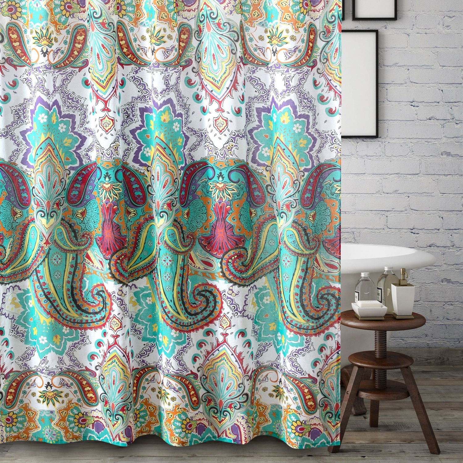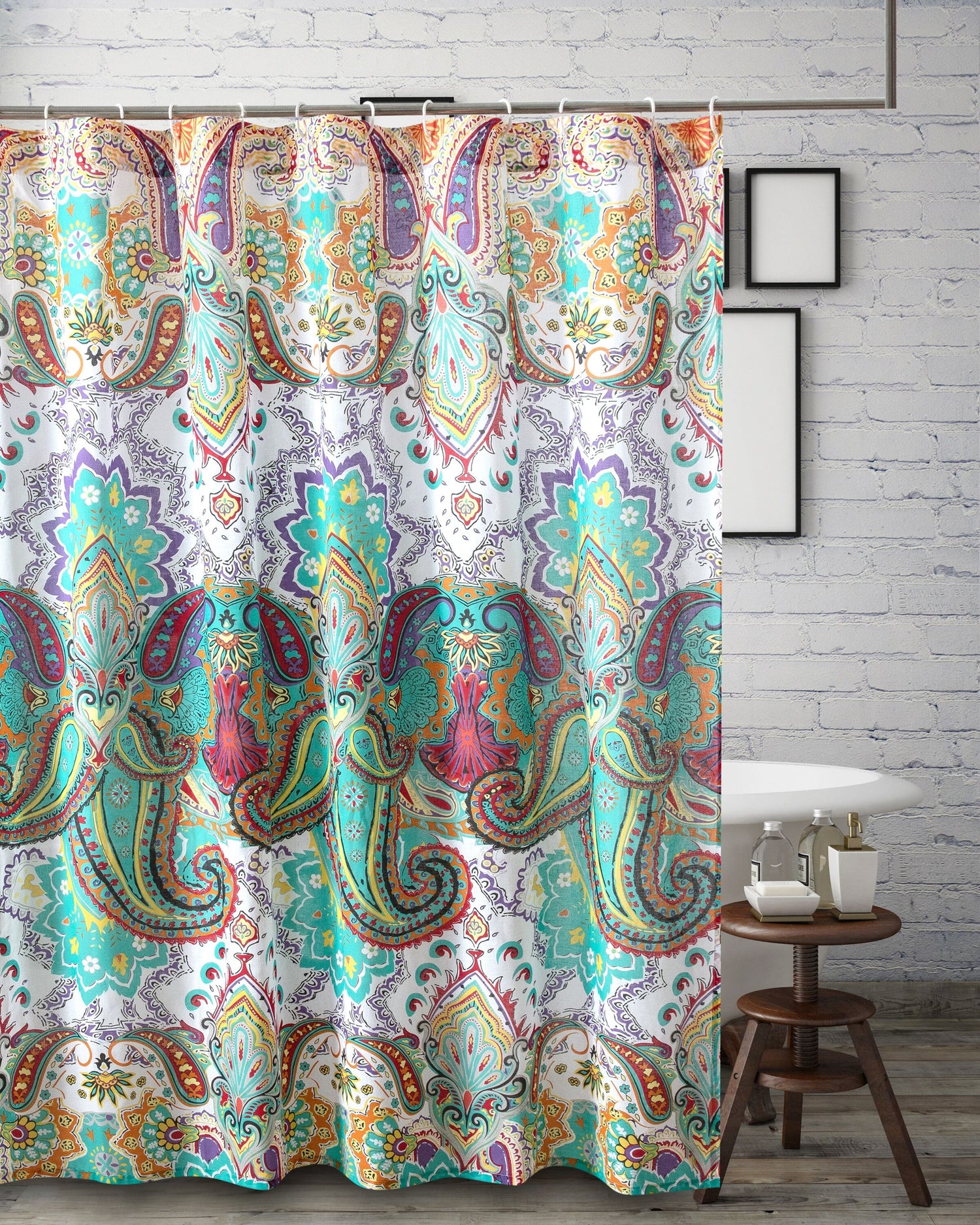 A sumptuous display of powerful paisleys, the Nirvana shower curtain combines vibrant colors in a dreamy collage. Turquoise, gold, saffron, ruby and amelthyst combine in jewel tones of bold enchantment. Reinforced button holes along the top for easy hanging. Hanging hardware not included. Designed for use with a waterproof liner (not included). 100% polyester microfiber. Machine washable.