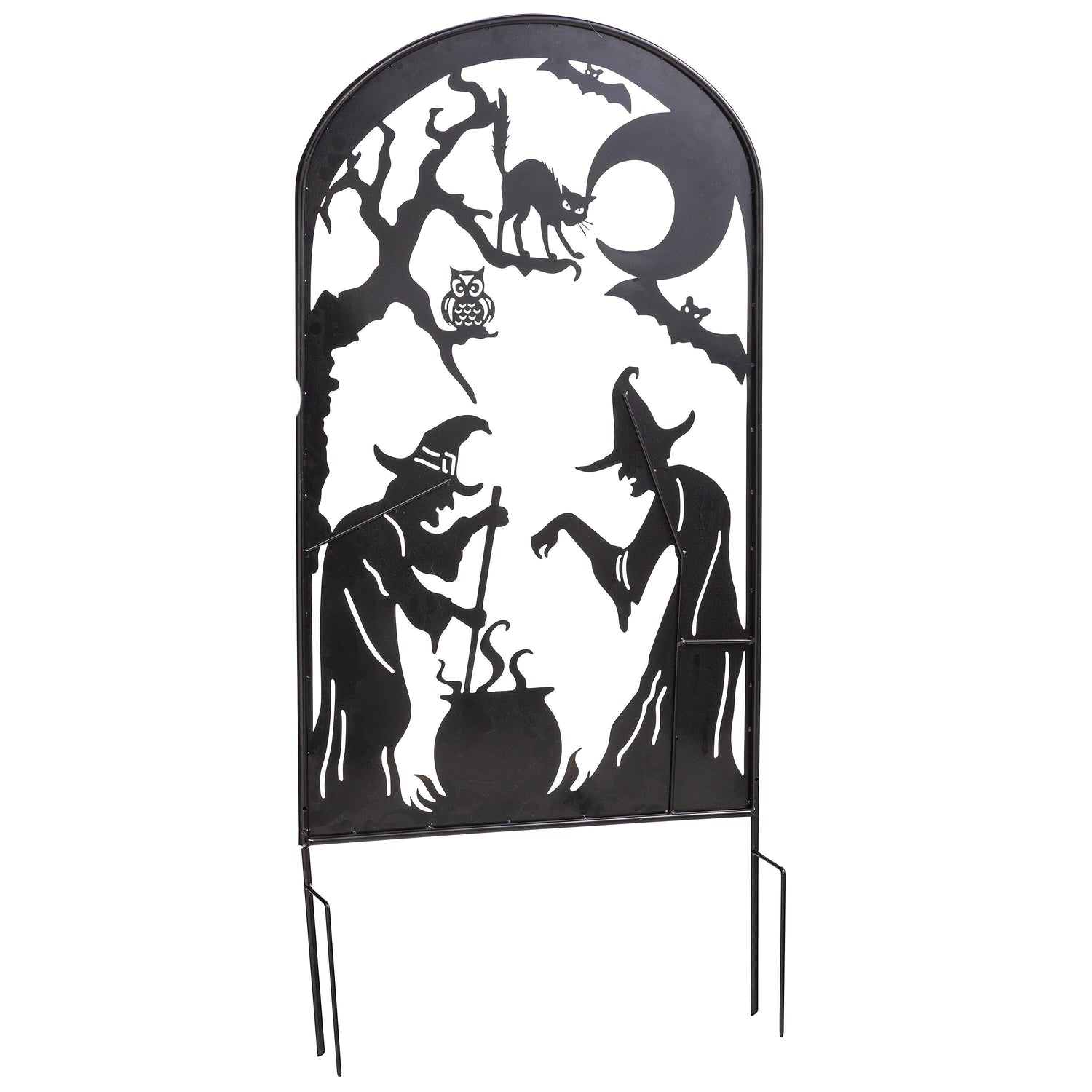 Witches trellis features two witches stirring a cauldron, while an owl and black cat look down at them from gnarled branches. Bats fly near the crescent moon.