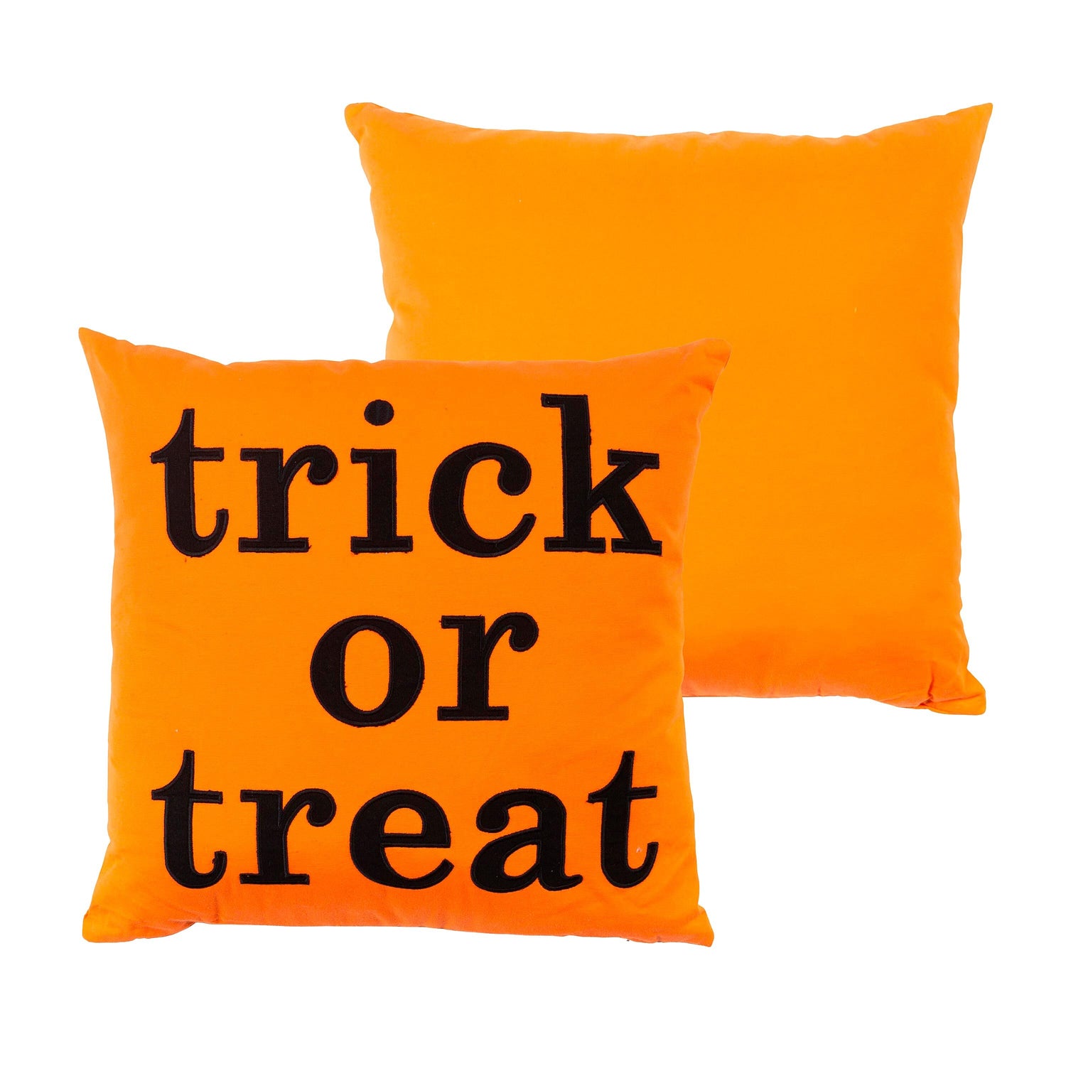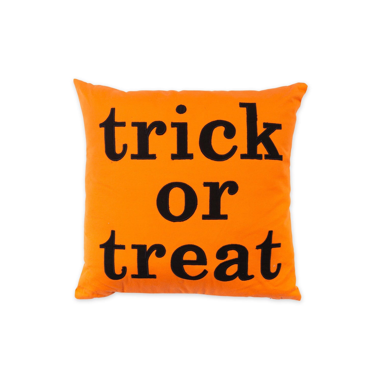 The Trick Or Treat Throw Pillow features black letters embroidered against a bright orange background.Each pillow has a removable, washable cotton cover; polyfill. Imported.