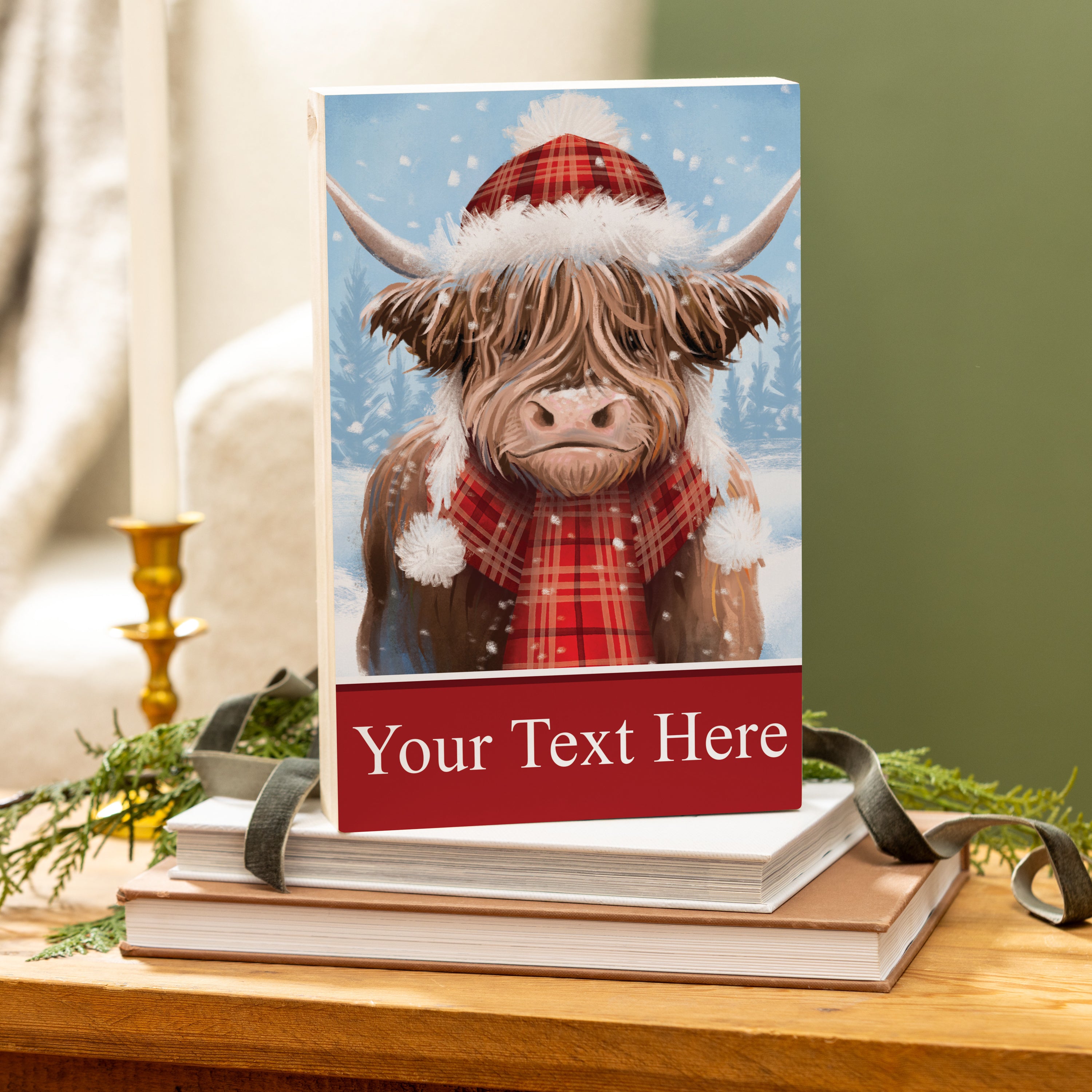 Holiday Poinsettia Highland Cow Wood Sign Plock With Personalization, 8"x12”
