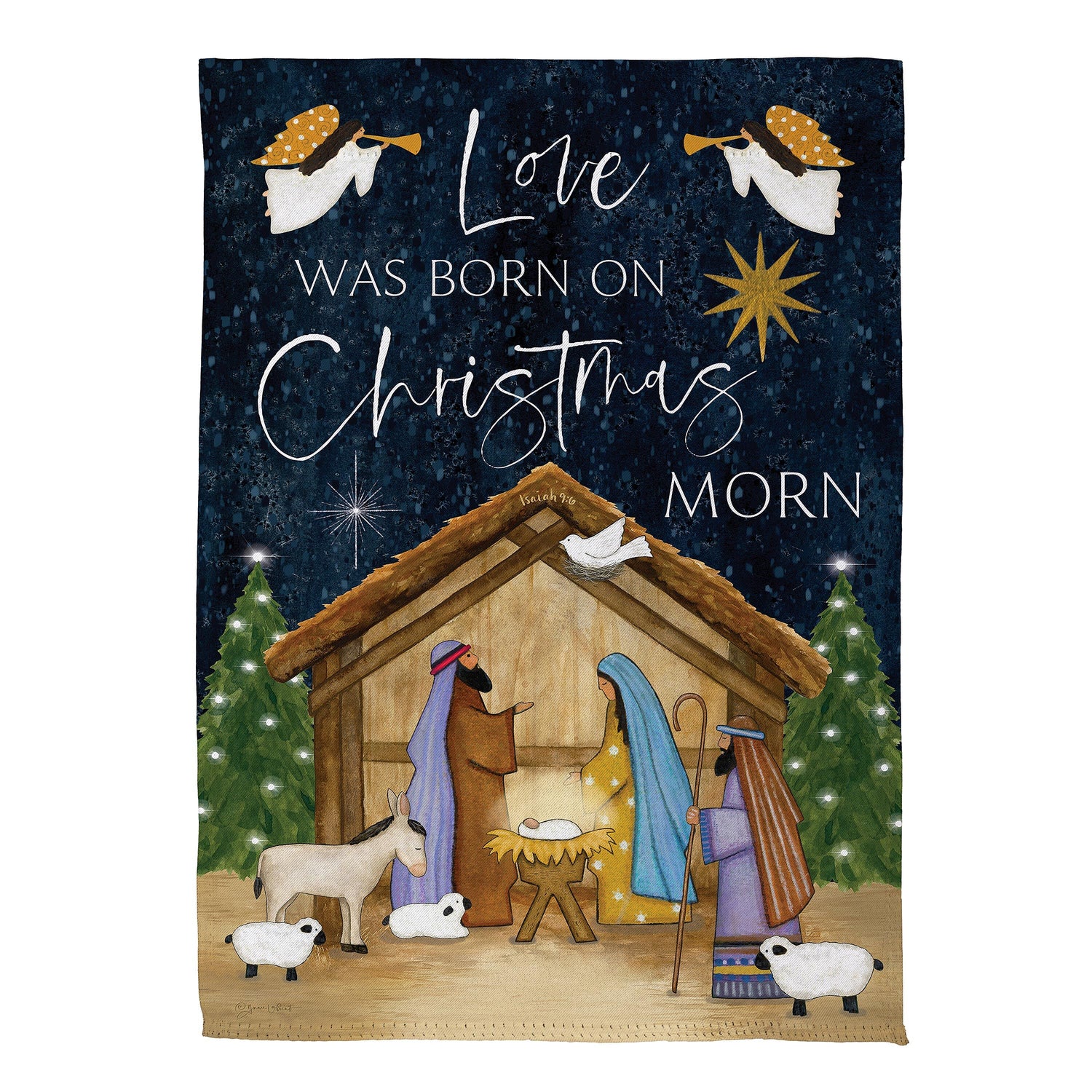 Add magic and wonder to any garden or yard when you hang up this beautiful flag. Featuring a heartwarming nativity scene, this flag is perfect for the festive season. Flag is crafted of medium-weight suede fabric made from recycled plastic that provides a soft and durable texture. Artwork is heat transferred onto the sun-blocking material so that it is easily viewed from both sides. The weatherproof flag will not fray or fade with continued outdoor use. This flag features a sleeve for use with any standard flagpole or stand, sold separately.