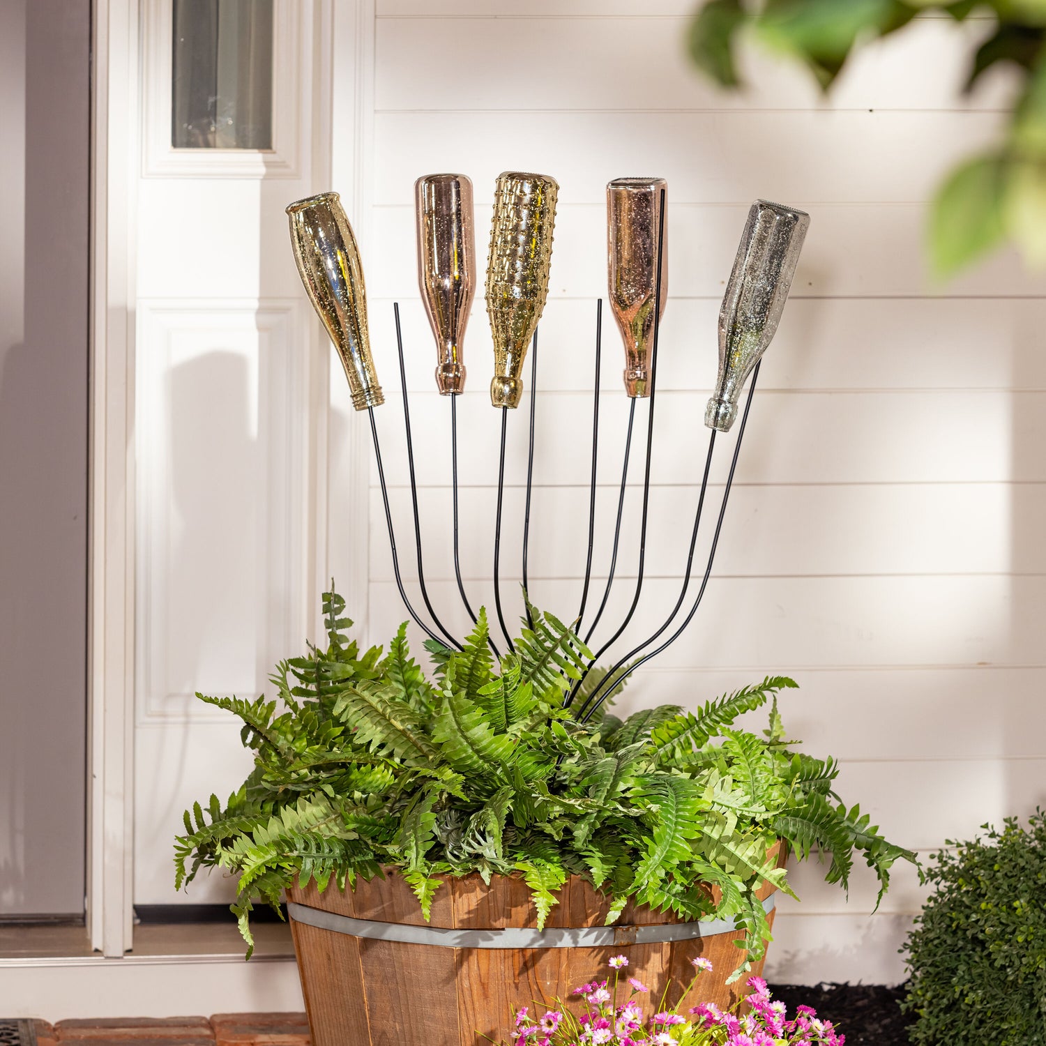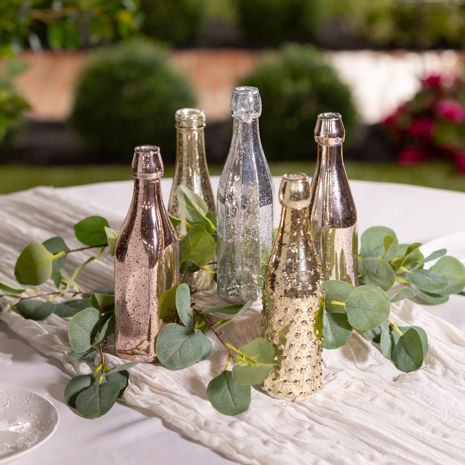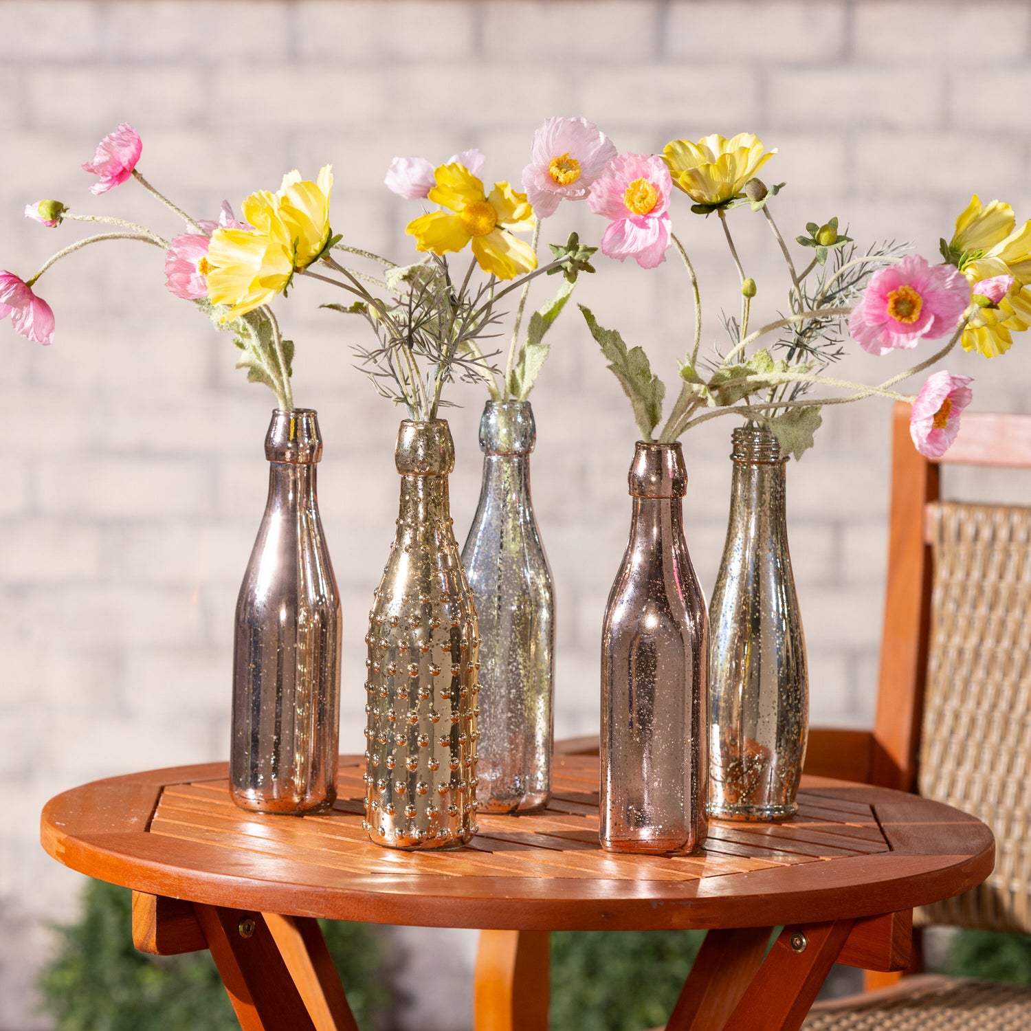 This set of 5 mercury glass bottles is perfect for adding a vibrant touch to any space. Whether used as flower bud vases, bottle tree decorations, or table centerpieces, these bottles are perfect decoration for home, wedding, office, and garden. These are designed to be used as a garden decor statement with our Metal Bottle Tree (sku 489093).
