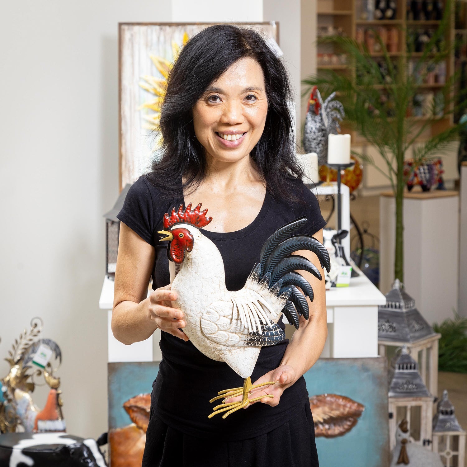 Petal & Plow Garden Statue, Metal Rooster With Light Feathers, 14"H