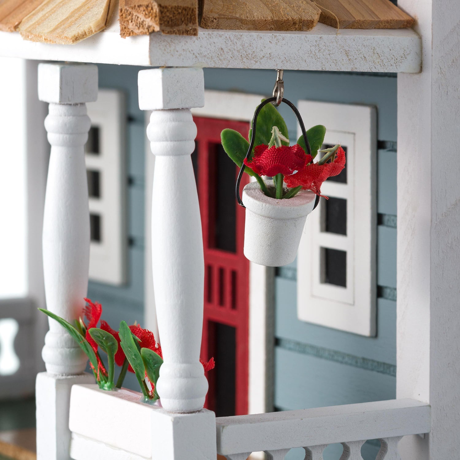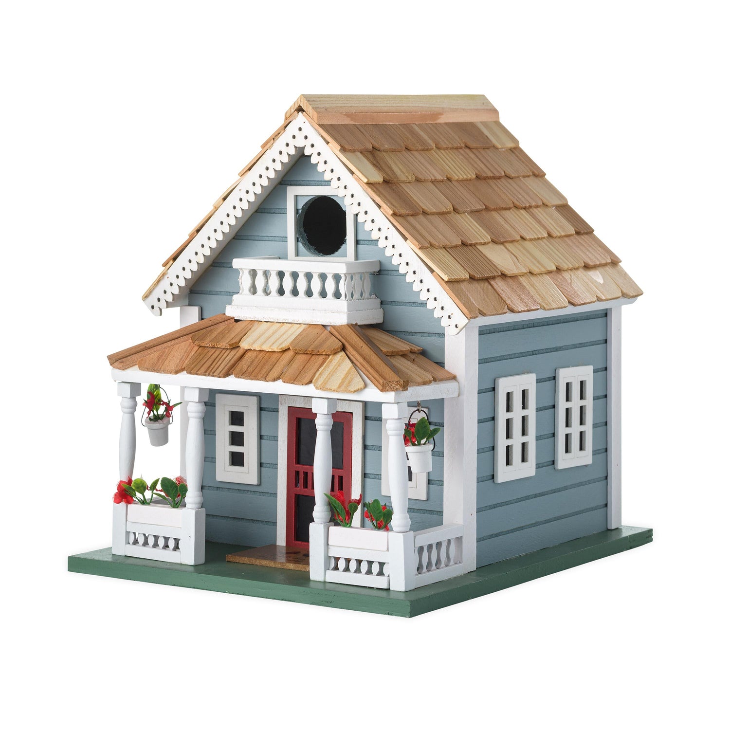 A cedar shingled roof tops off the cottage graced with baskets and planters of red flowers, gingerbread trim, balcony and lots of windows. Painted in soft blue with bright white trim, no detail has been overlooked.