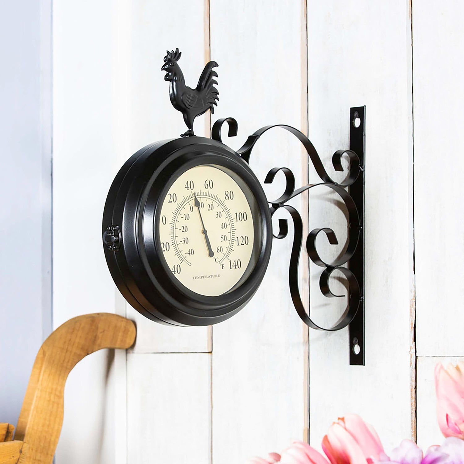 - Charming double-sided outdoor clock and thermometer with a rooster topper