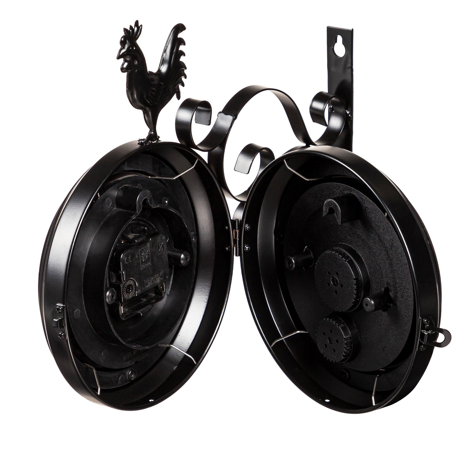 Topped with a rooster, the double-sided clock has a sleek black finish that adds to its contemporary feel. Durable and high-quality materials ensure this design is outdoor safe and weather-resistant, and won't fade over time.