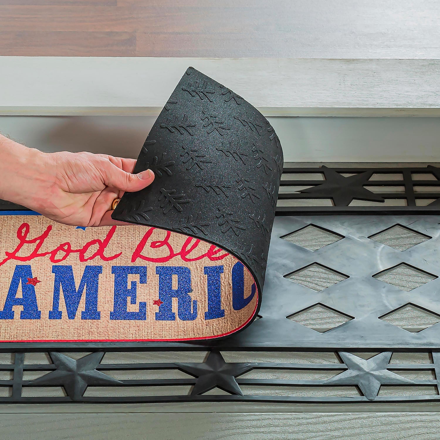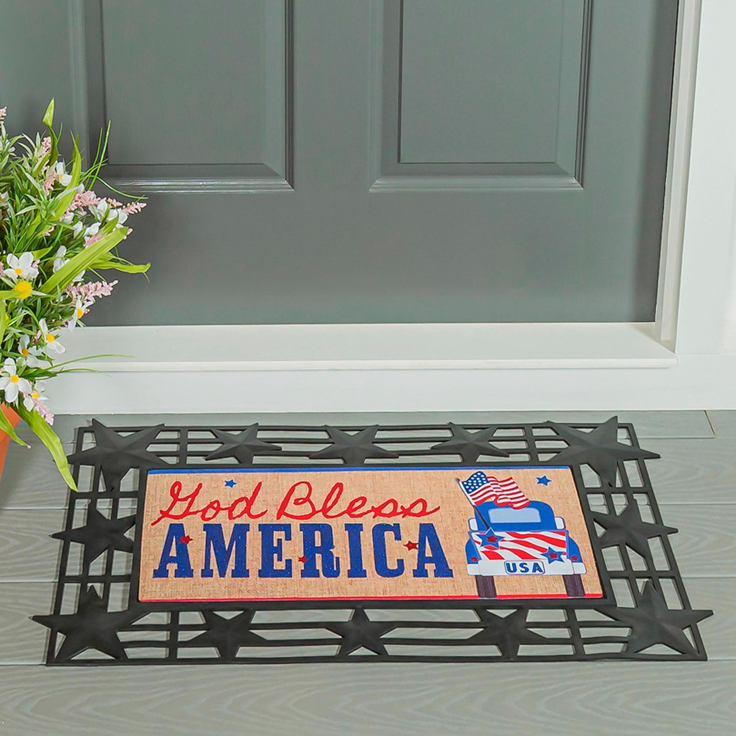 The matching doormat is printed with the truck, flag, and same proud message. Crafted from printed polyester with a rubber backing, the Sassafras mat traps dirt to prevent messy homes - perfect for busy households. With its “God Bless America” message, this mat will greet guests in patriotic style.
