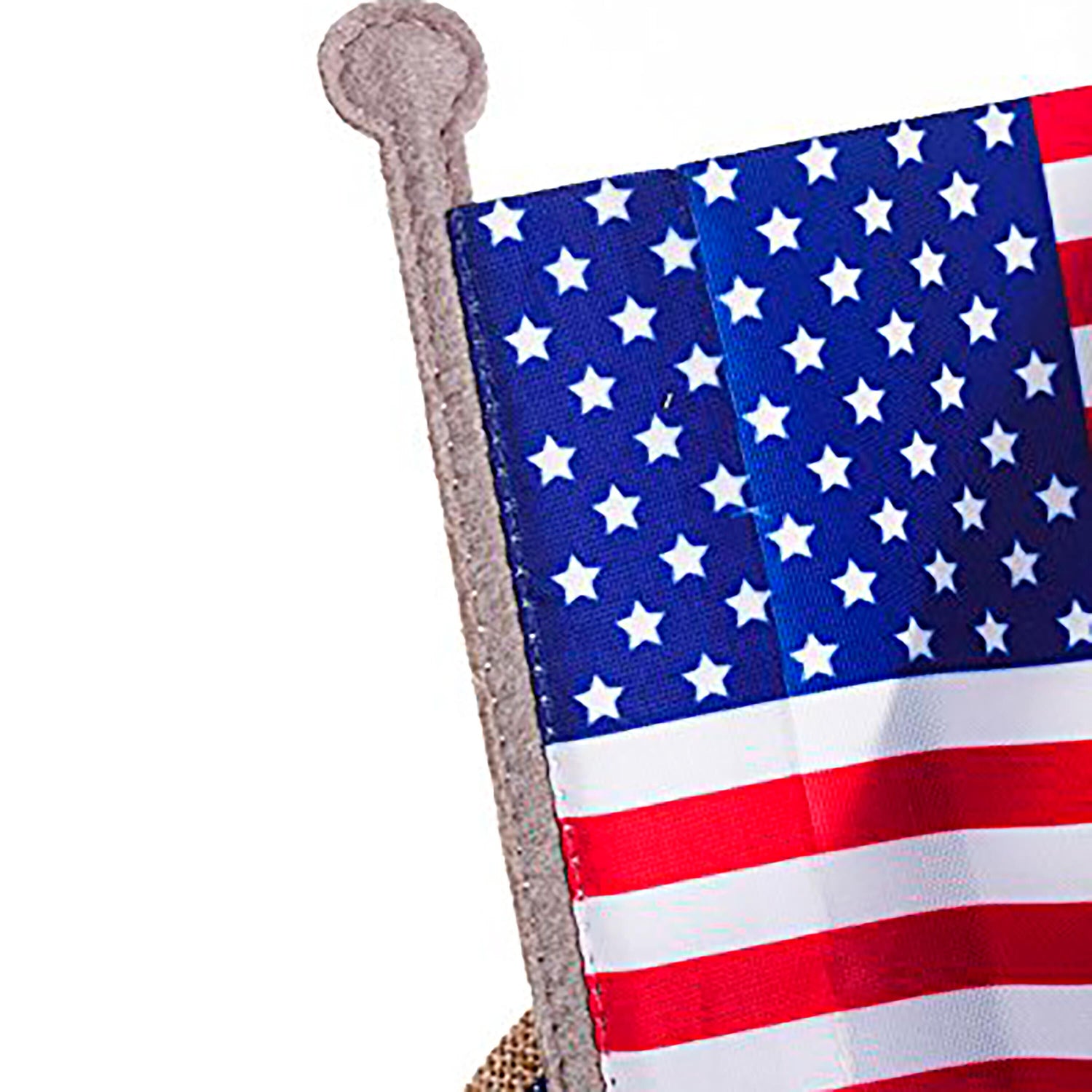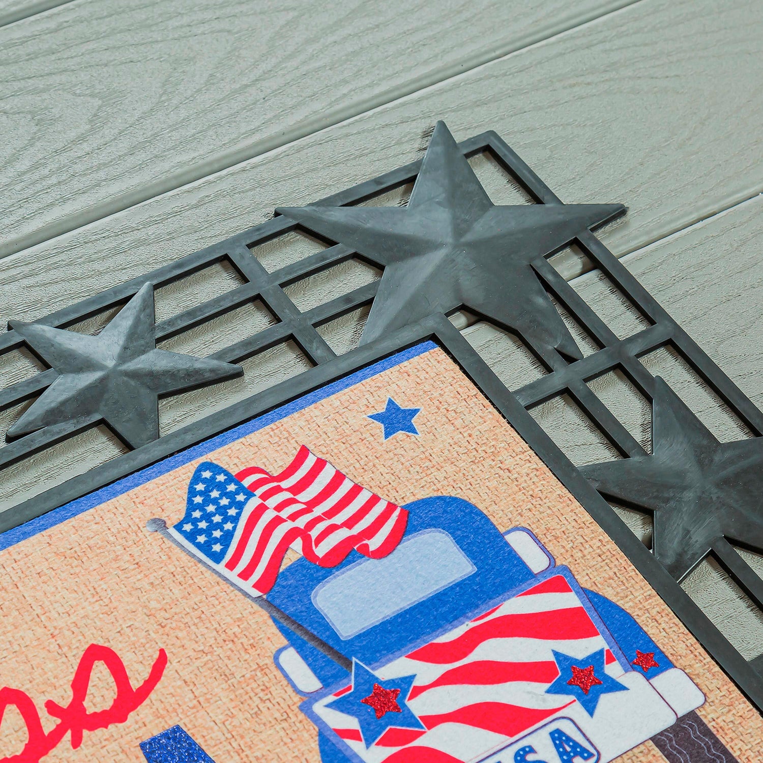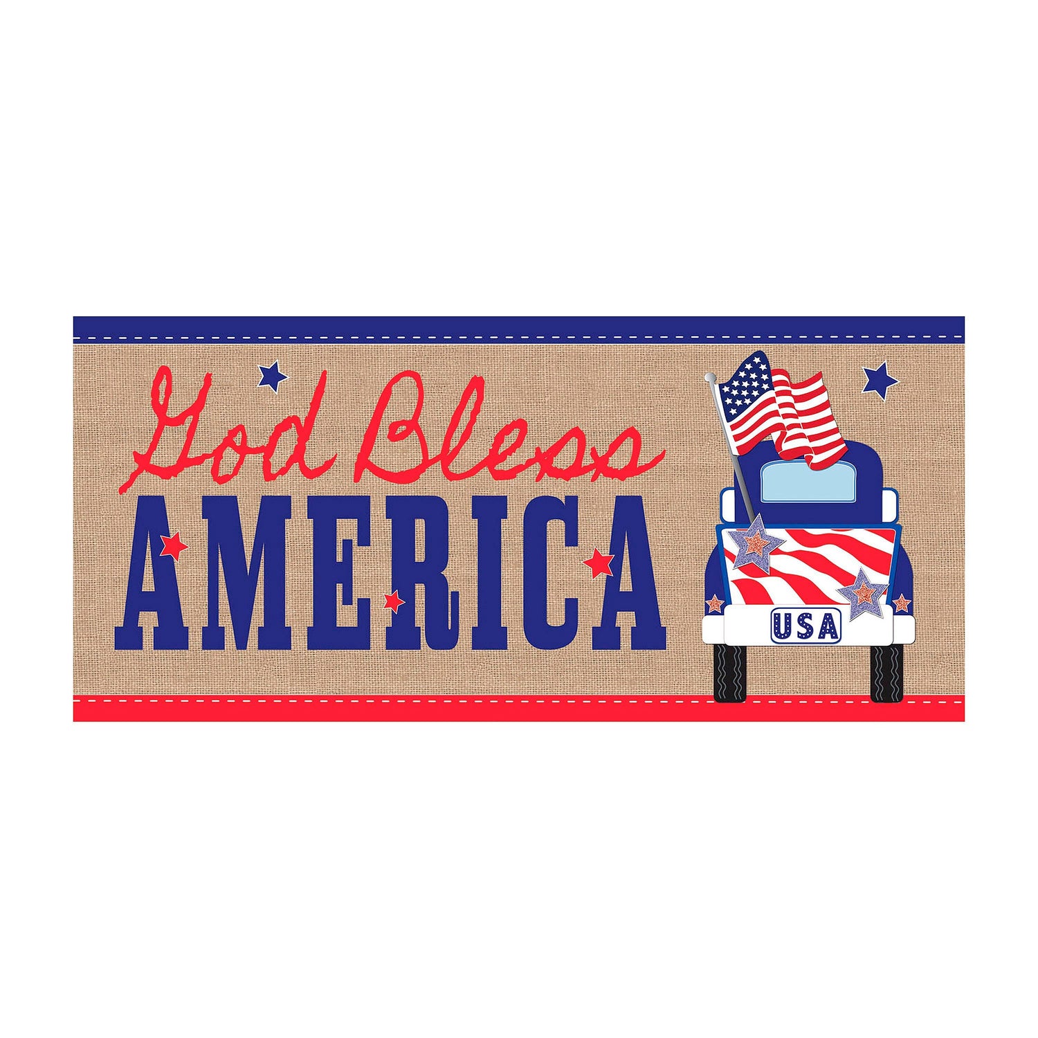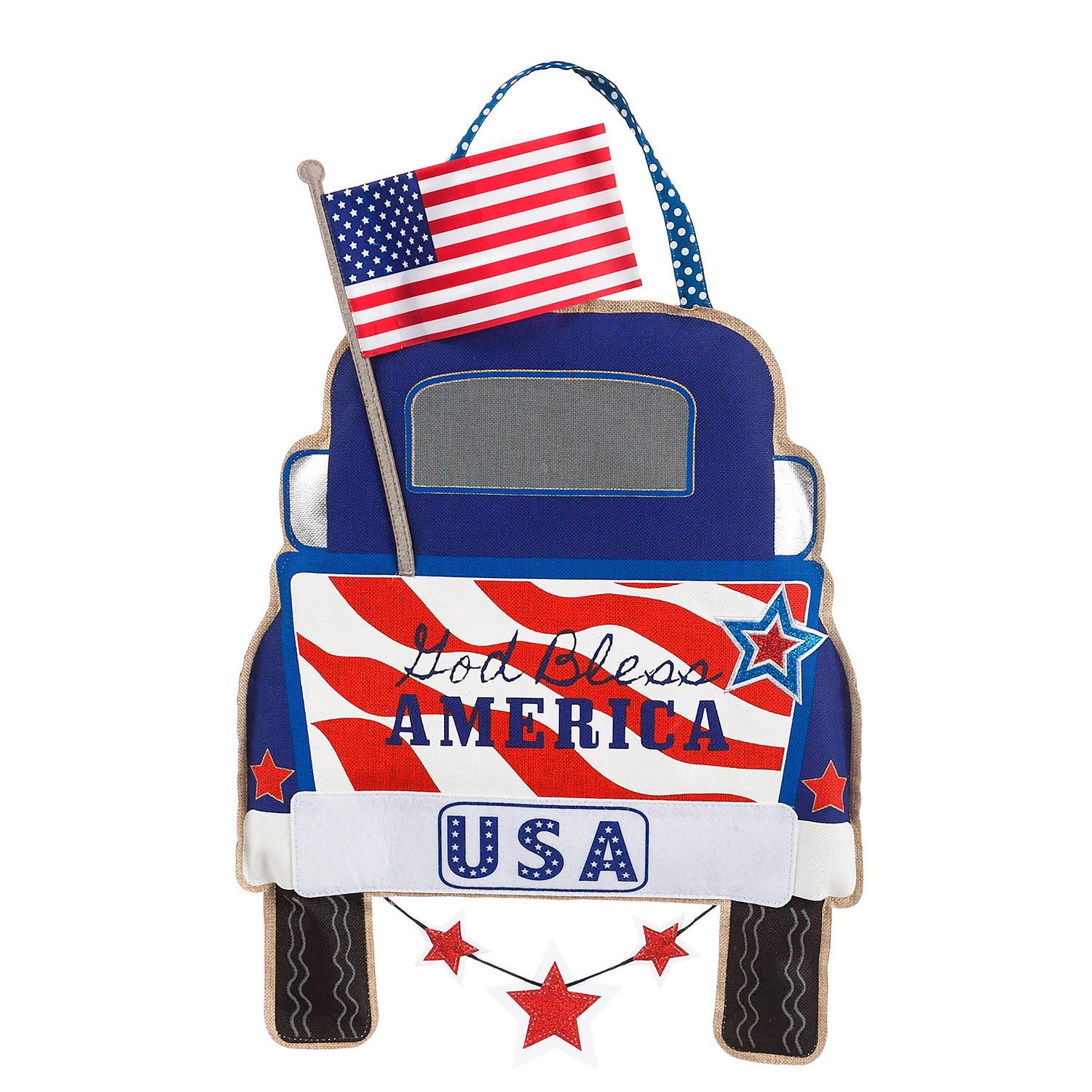 Get ready for Independence Day with this Patriotic Door Decor and Sassafras Mat set. The red, white, and blue stunning 3D Door Decor is shaped like a classic blue pickup truck, holding an American Flag and proudly exclaiming “God Bless America”.