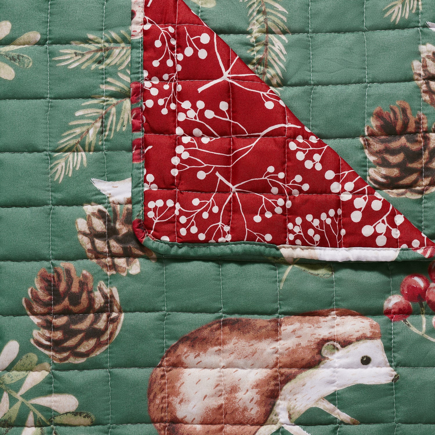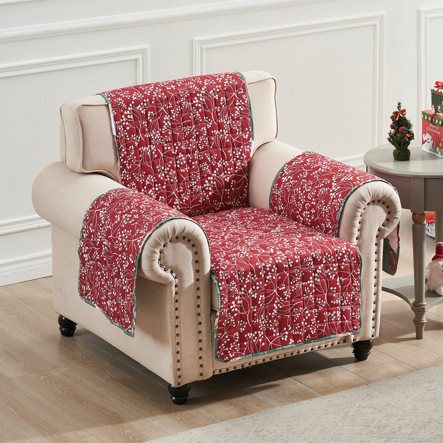 Protect your furniture from spills, pet hair, paws, wear and tear with these generously sized furniture covers. Bring whimsical holiday spirit into your home with the Willow furniture protector. Featuring festive red, green, and natural forest colors, this quilt showcases friendly owls, foxes, hedgehogs, and songbirds, with charming details like Santa hats on the owl and fox. The reverse side displays a budding willow print in red and white, adding a delightful touch of the forest to your holiday decor. Mix and match reversible furniture covers for variety and convenience. Big enough to provide ample coverage on most home furniture. Reversible protector is printed on one side with a complimentary print on the other for two looks in one. The elastic strap holds protector in place on your furniture.