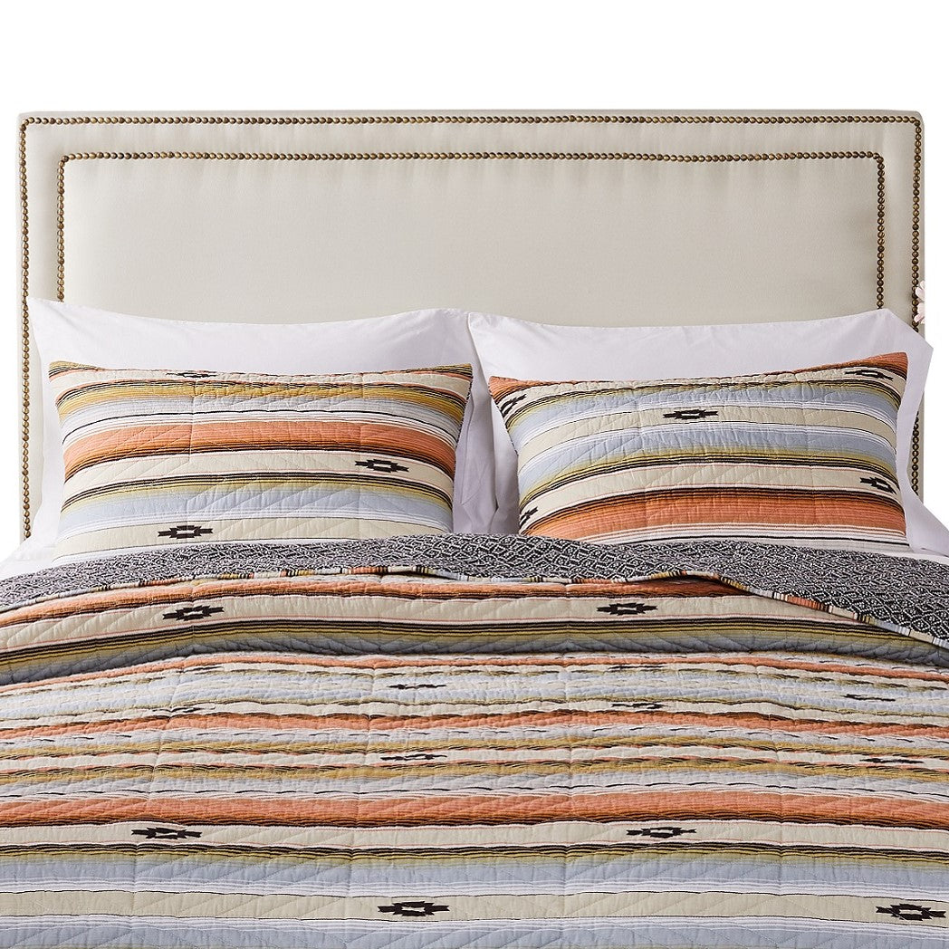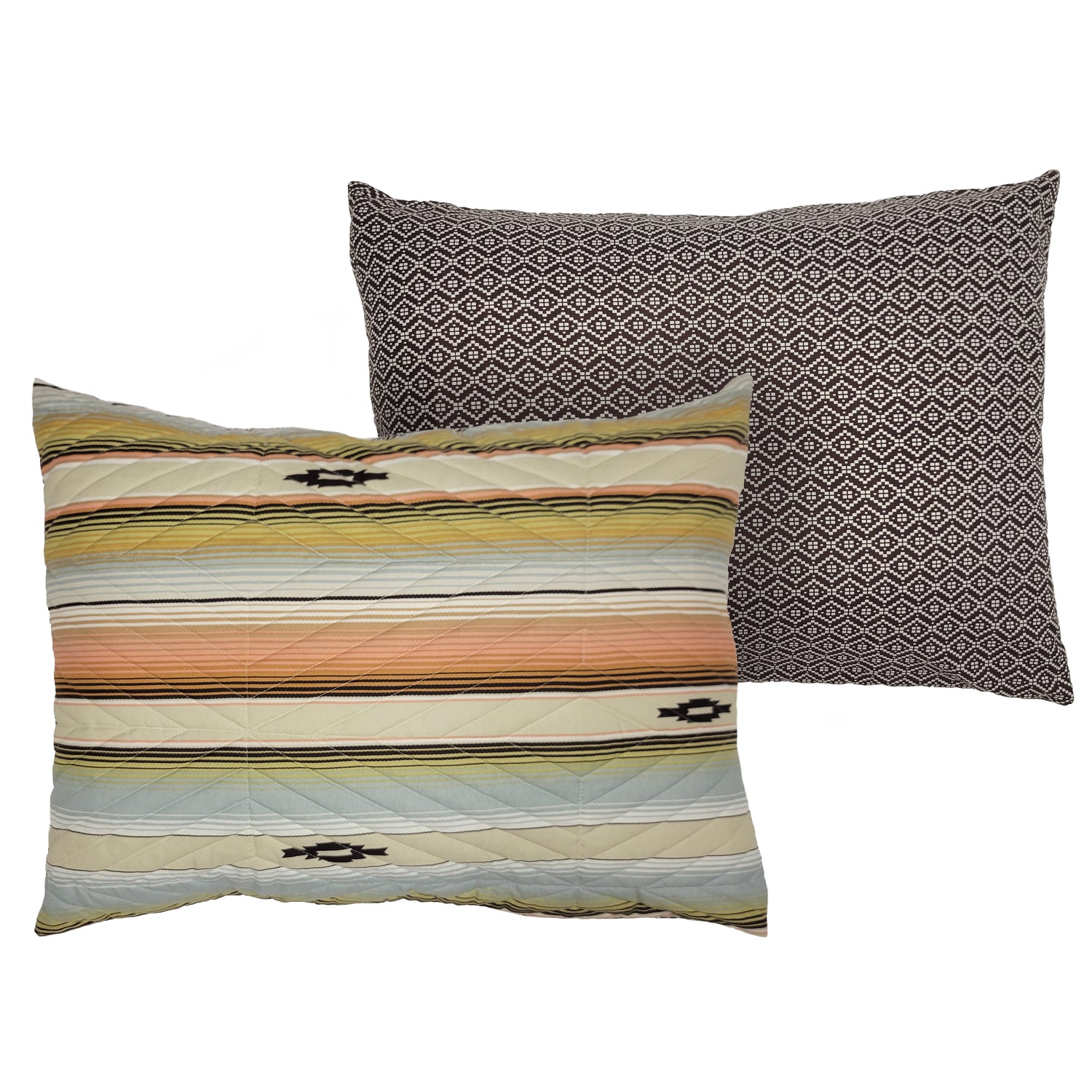 Bring home Southwestern styling at its most refined! Sage and desert rose stripes against a natural sand ground are embellished with thunderbird motifs and geometric chevron quilting. Painted Desert offers the simple sophistication of Southwest style to transform your space with rustic flair.  Colors include charcoal, millennial pink and green on a natural linen ground. Reverses to a complimentary geometric print in coffee bean brown. Decorative quilting enhances the durability of each piece. Prewashed with extra softener for unparalleled comfort.