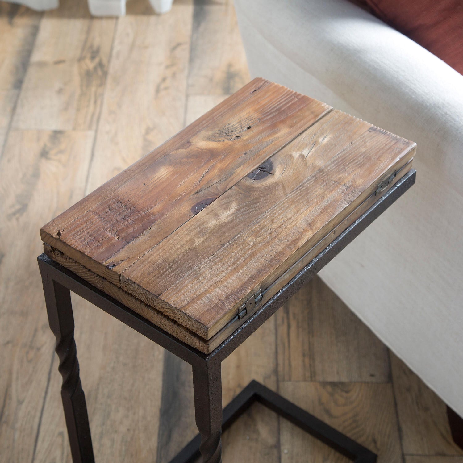Our practical Deep Creek Pull-Up Table features folding leaves that open for extra surface space. Space-saving, practical design gives everyone extra room for entertaining or everyday use. Its rustic wood surface adds charm to any room, while the metal frame with a twist detail stands up to lots of use. A compact, thoughtful design makes it a great piece in any room. C-stand allows it to slide under furniture for easy of use.