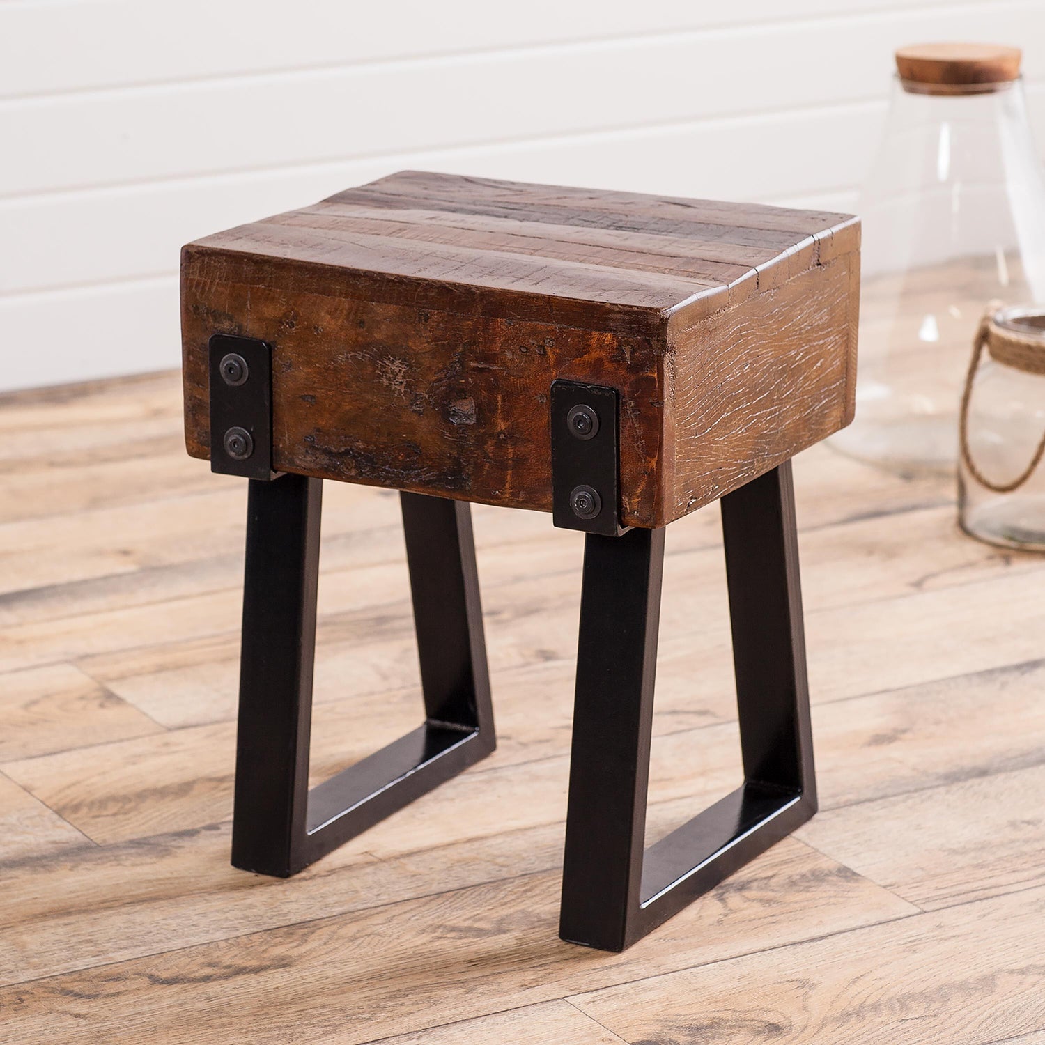 The top is made of reclaimed shorea wood railroad ties. This naturally dense wood is beautifully distressed with an antique look – each Stool/Side Table is unique and full of character. Slight variations in the wood means yours is one-of-a-kind!