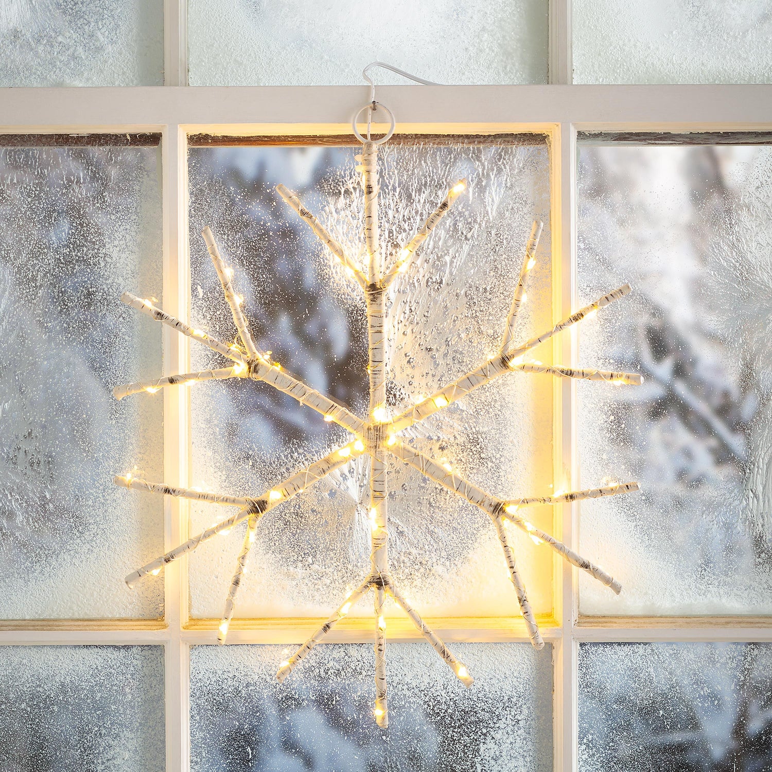 Realistic-looking faux birch branches are fashioned into a snowflake design and wrapped with a string of 75 warm white micro LEDs to add a special touch to any space.