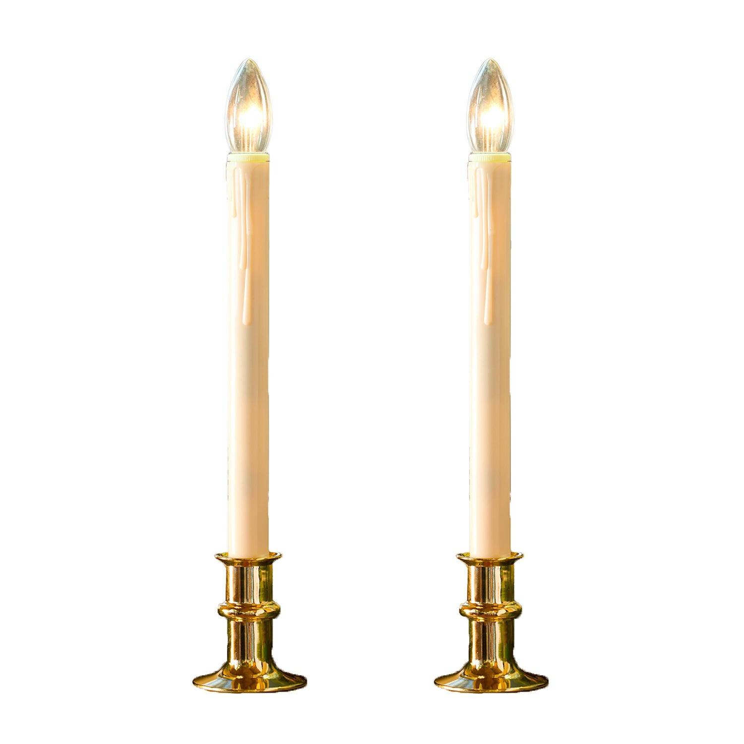 Our battery-operated candles adjust to two heights, 8½"H or 11"H, for an ideal fit in your window. A compact 2" dia. metal base fits onto most window sills. The dual-intensity LED bulb directs bright light outside while emitting a softer glow inside, making it easy to see from the street yet with less unwanted light in your room.