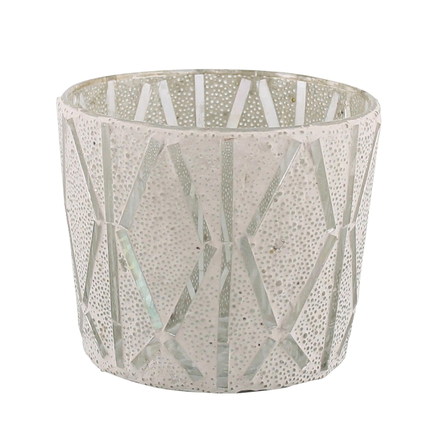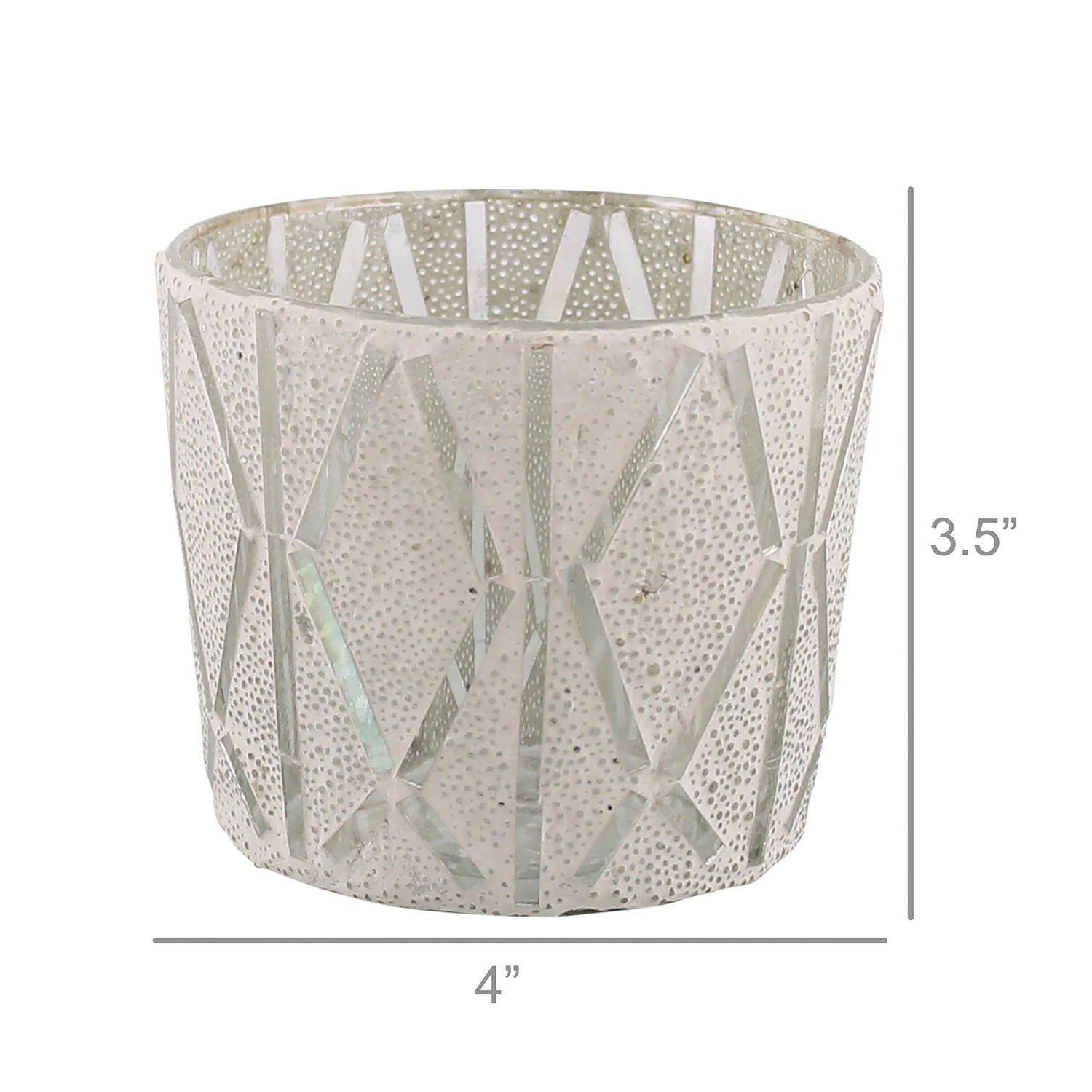 A dappled glass mosaic provides peeks at the warm candlelight through our snow-white finish hurricane. Candlelight flows out of the angular cutouts, creating a wintery glow on a fireplace mantel, entryway console or buffet. Group with multiples of the coordinating size to create a snowy centerpiece on the dining table. Handcrafted in India by our artisan partners.