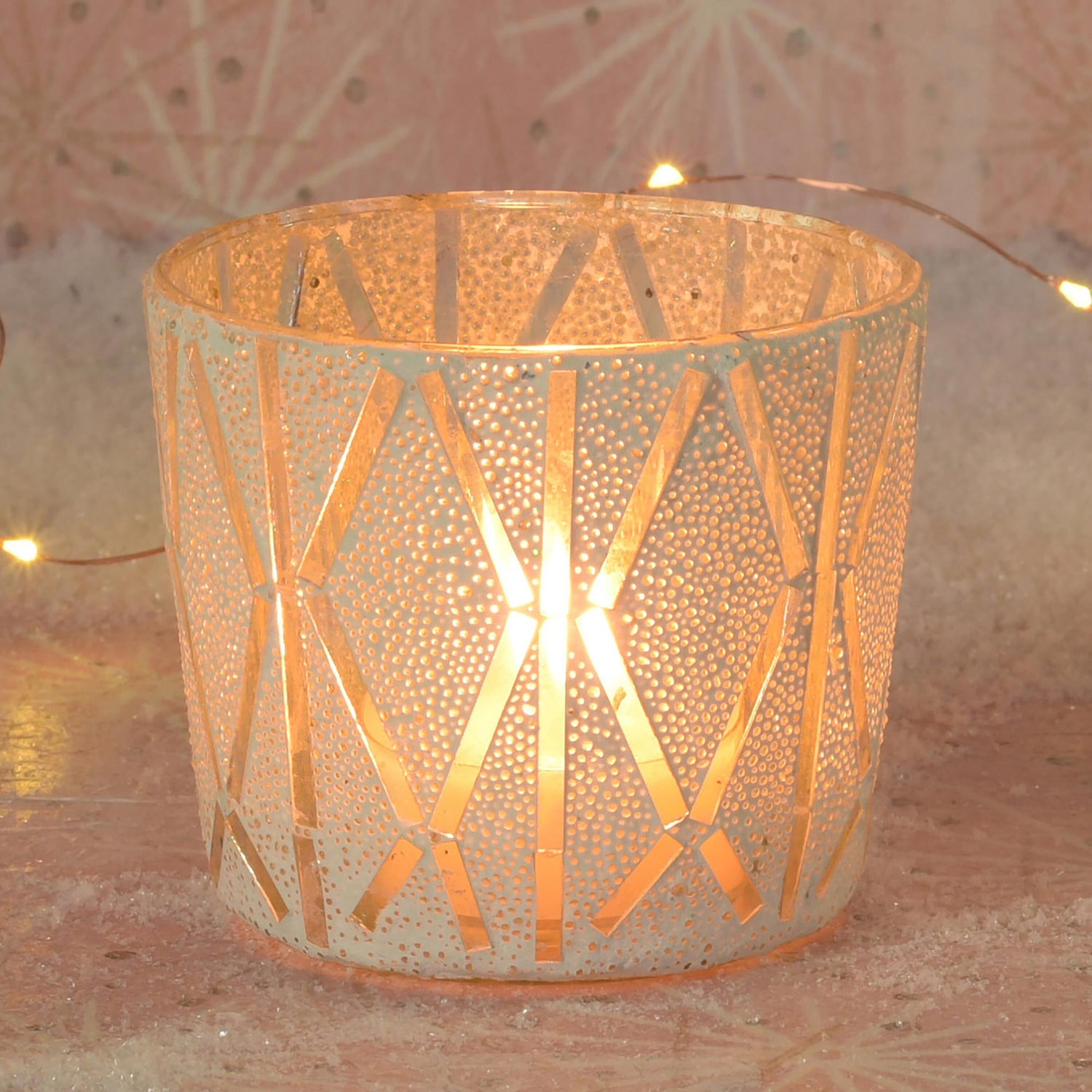 - Candlelight flows out of the angular cutouts, creating a wintery glow on a fireplace mantel, entryway console or buffet