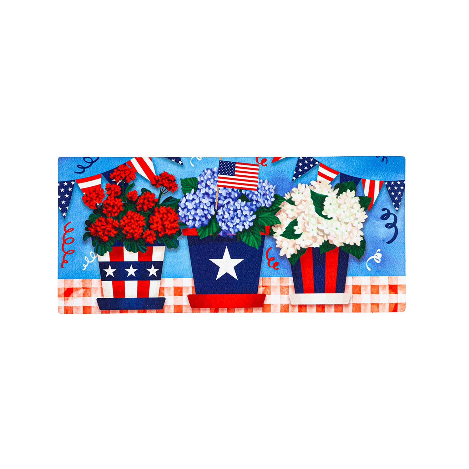 Celebrate Independence Day or put your American pride on display through every season with this Patriotic Flower Pot Sassafras Switch Mat. With blooming hydrangeas in red, white, and blue, this Americana-inspired floral mat will add plenty of character and color to your doorstep. Part of our bestselling Sassafras Mat collection, this mat insert is crafted from printed polyester with a rubber backing, and is designed to fit neatly within any of our Sassafras bases and trays. Designs are sublimated onto the outdoor-safe material using fade-resistant inks. Perfect for indoor or outdoor use, these versatile Sassafras mats successfully trap dirt while making a stylish statement.