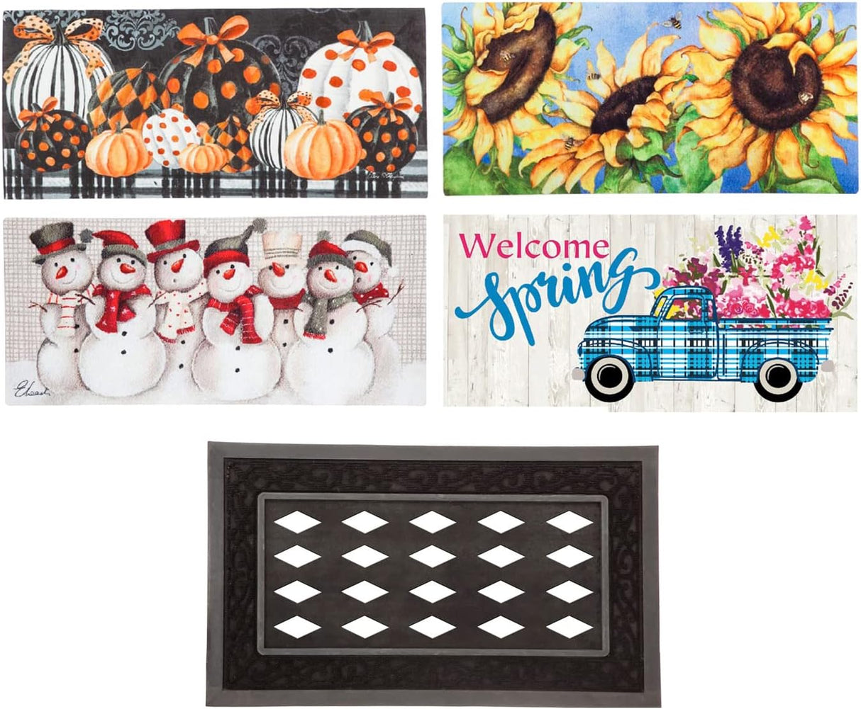 Welcome style to your doorstep with this beautiful mat set. These durable and vibrant doormats make decorating year round a breeze! Sassafras mats are constructed of durable rubber for a non-slip grip and extra protection against the elements. Now you can get a stunning seasonal selection of these top sellers in one convenient set. Includes four interchangeable mats and our signature mat tray. Each mat measures 10 x 22 inches. Mat tray measures 18 x 30 inches.