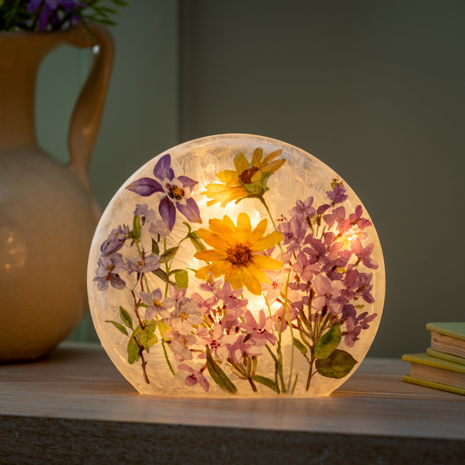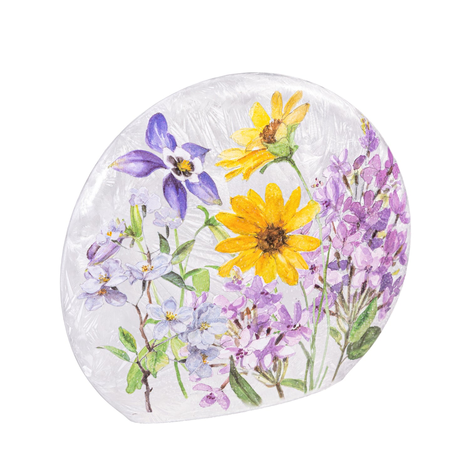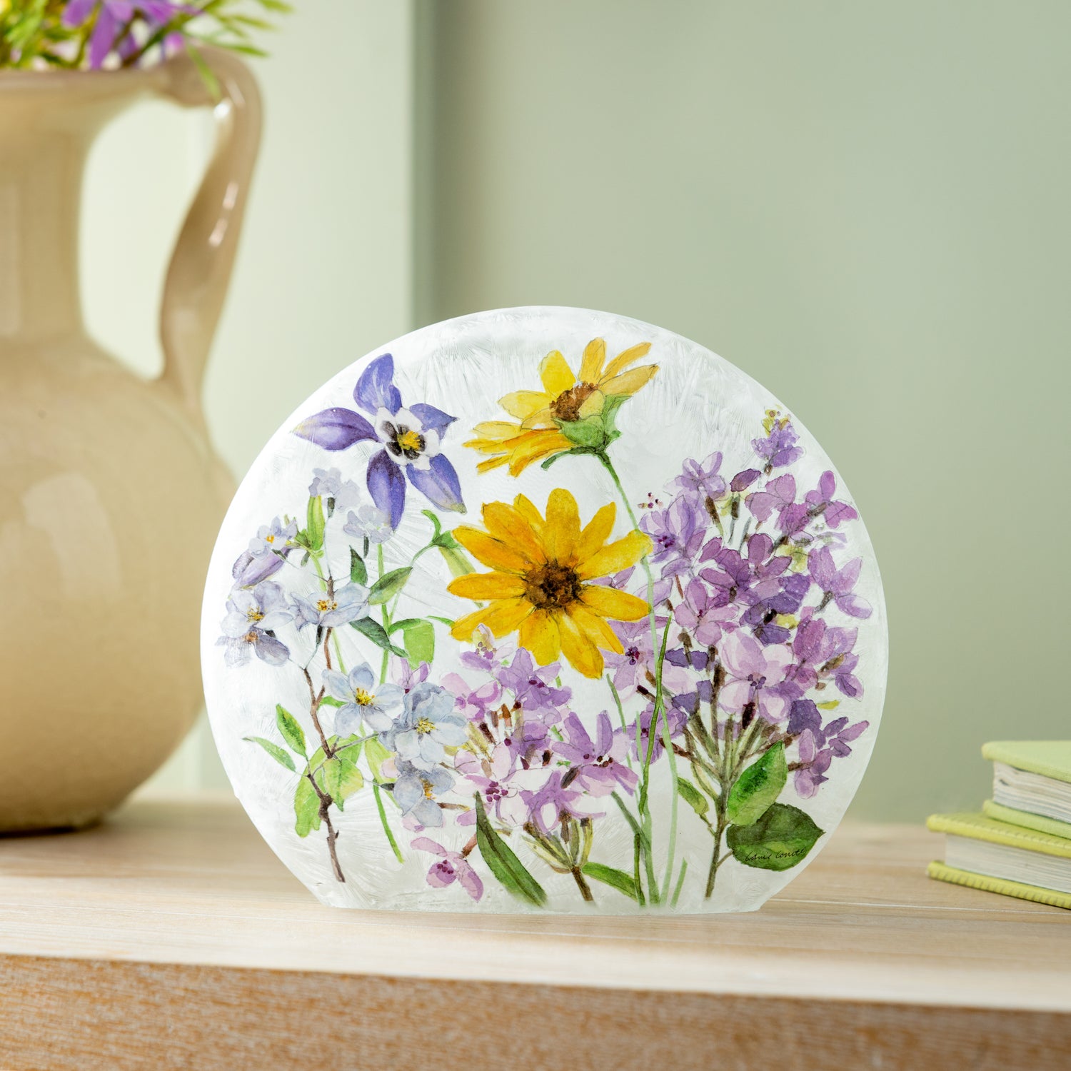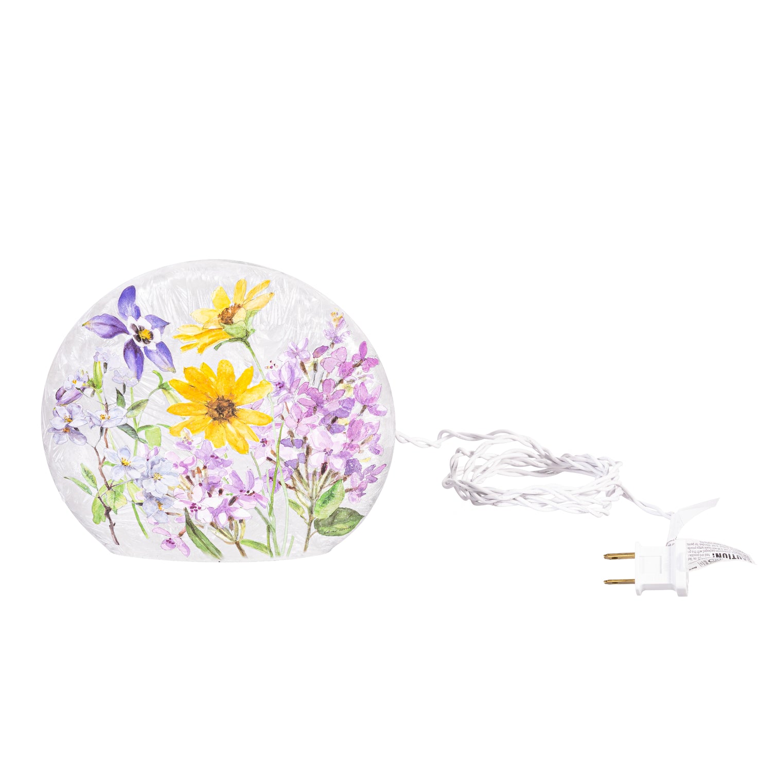 Celebrate the beauty of wildflowers year-round with our Gingham Florals Lighted Orb. This charming piece features a delicate bouquet of hand-painted blooms—sunny yellows, soft purples, and vibrant greens—captured on textured glass for a luminous, watercolor effect, all illuminated from withing by a string or warm LED lights.