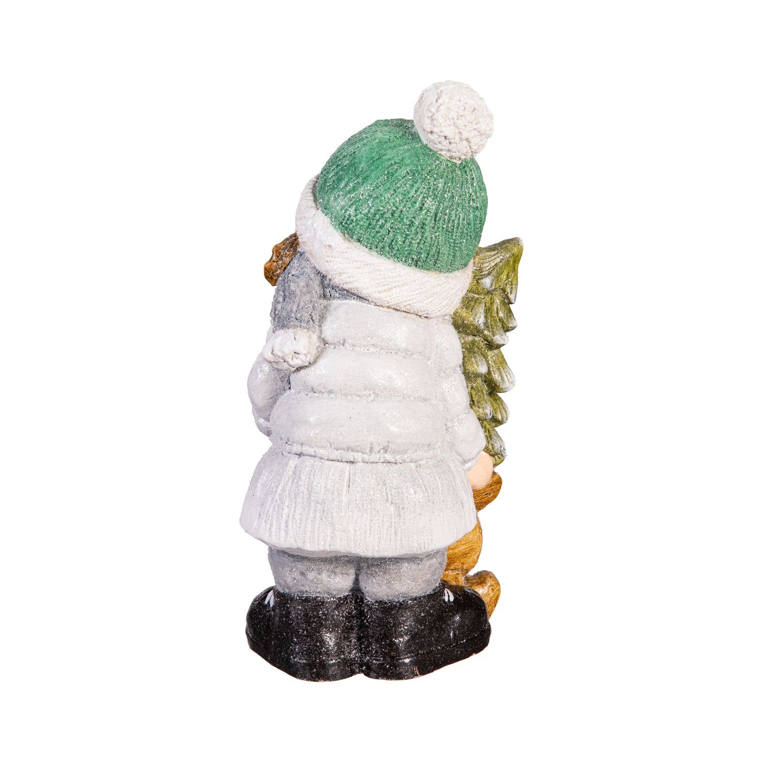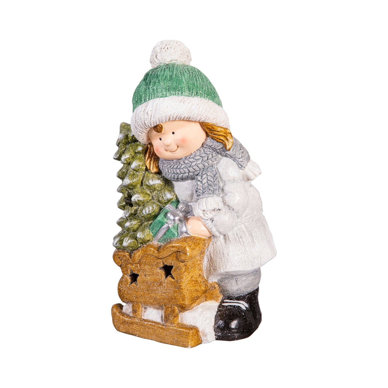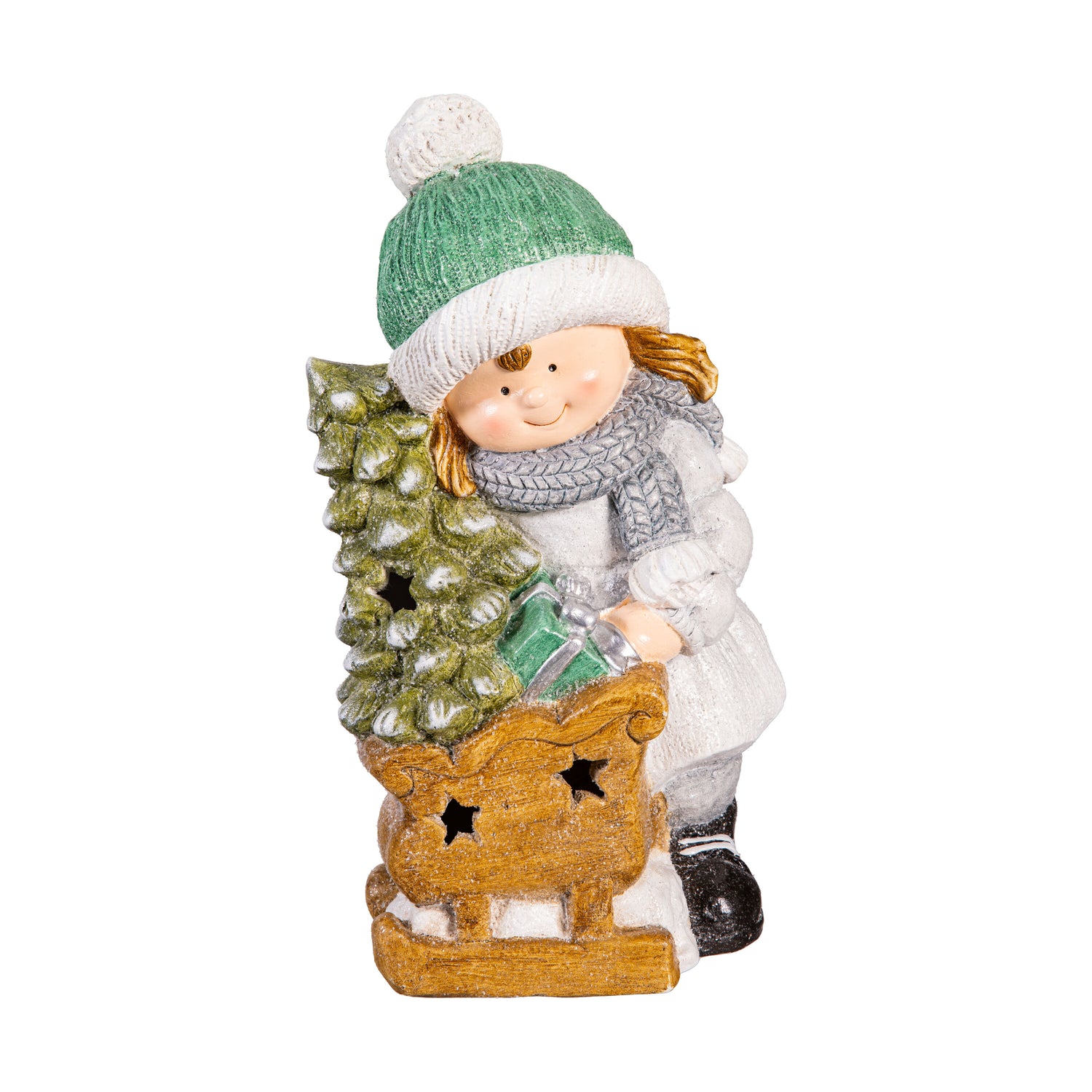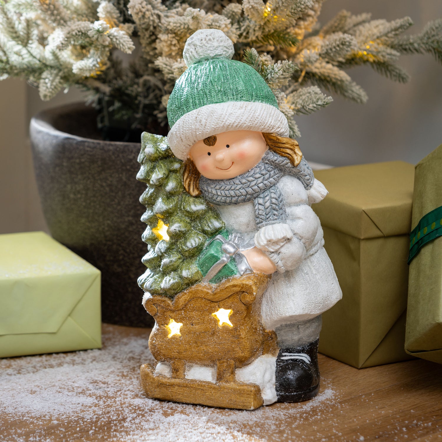 This pair is decked out in their winter finest, complete with fluffy hats, coats, boots and LED lighted Christmas trees for a warm glow. The cheerful boy is clad in a gray parka with green hat and hauling his tree in a starry sack and the gleeful girl is pushing her tree in a brown sled while both are peppered with snowflakes for a winter wonderland look.