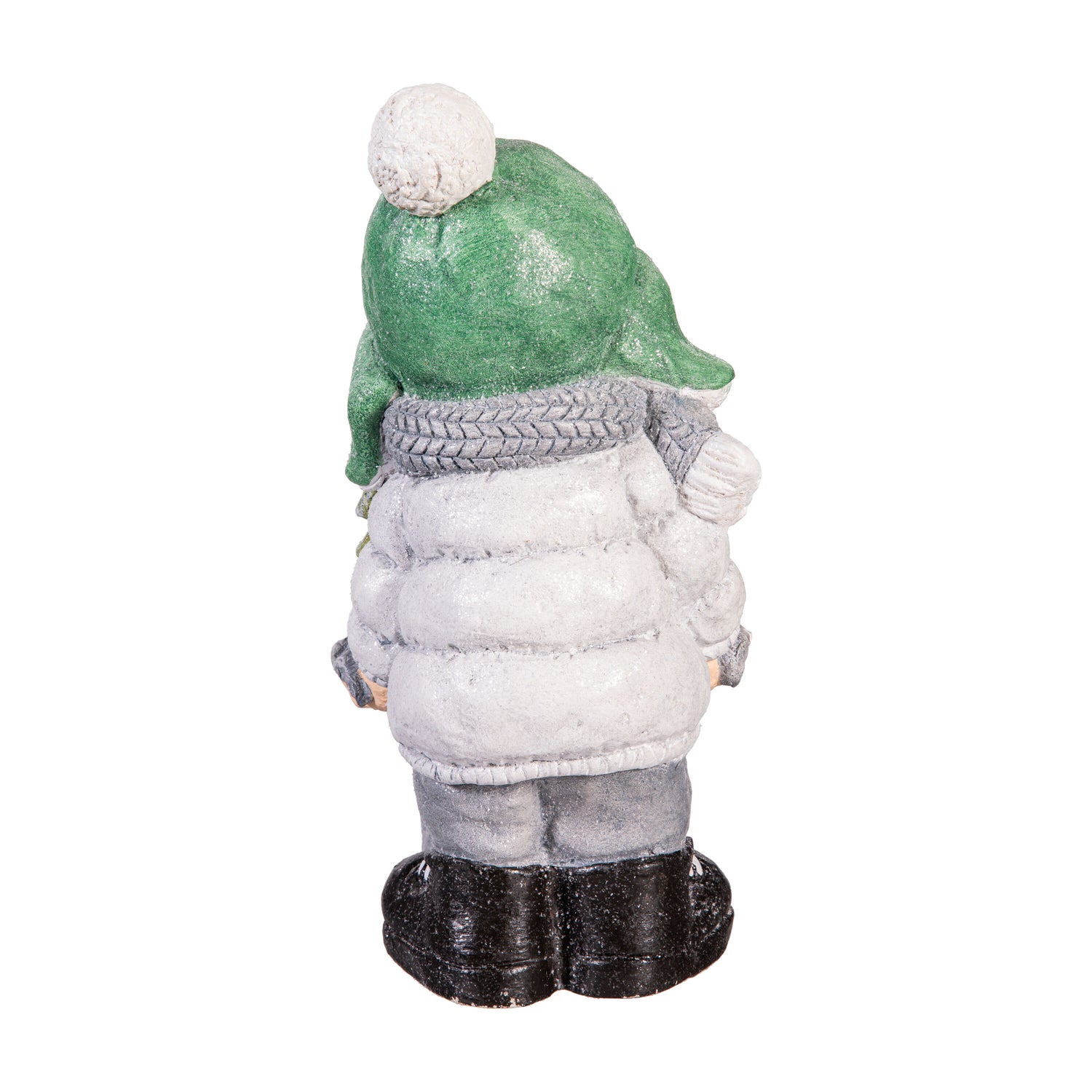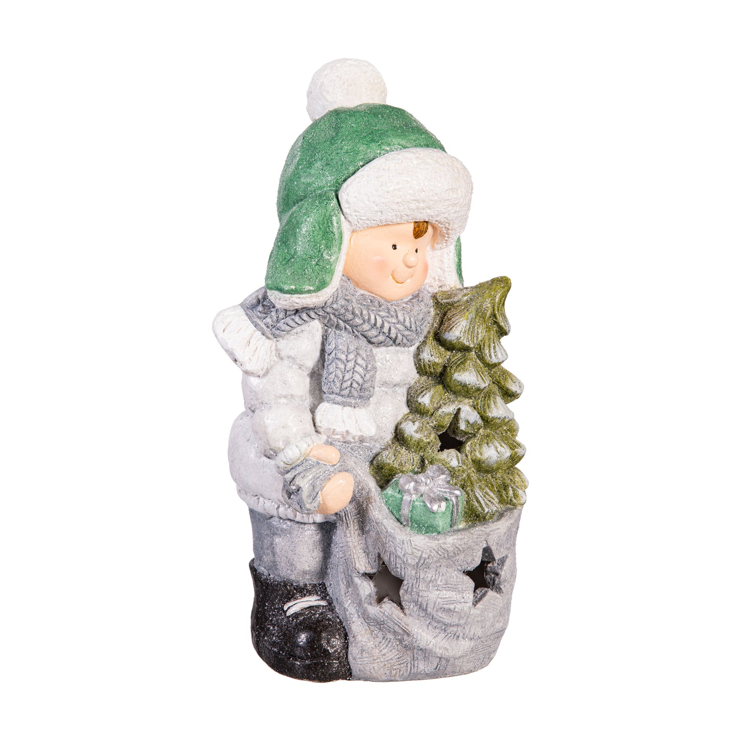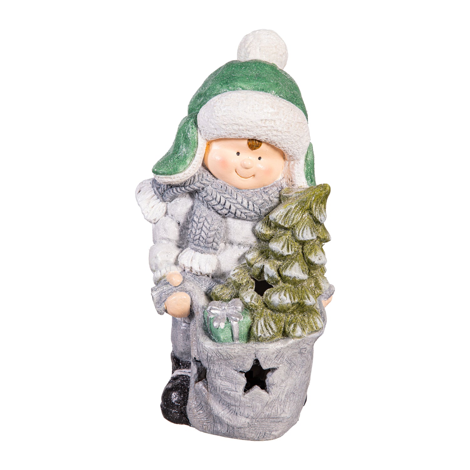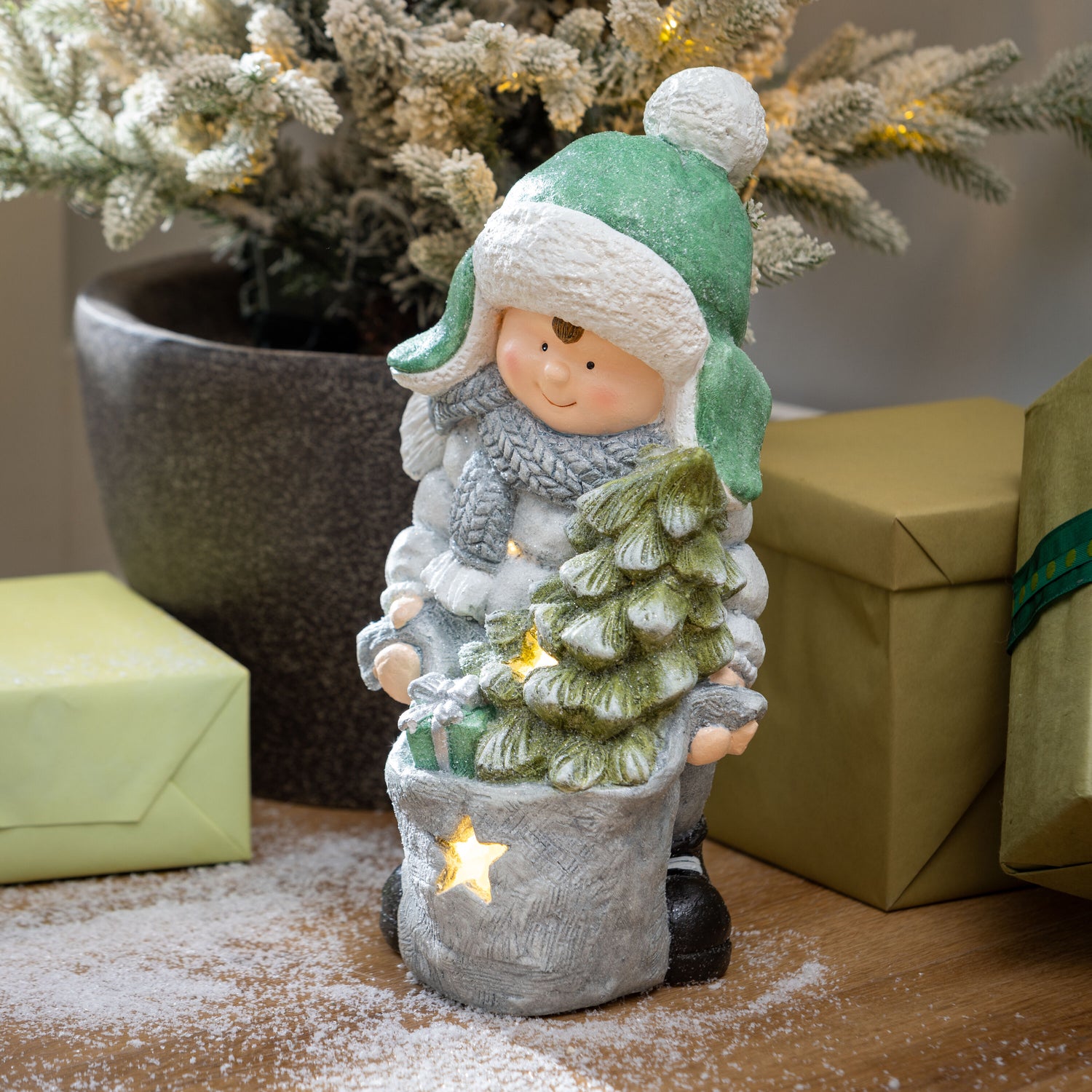 This pair is decked out in their winter finest, complete with fluffy hats, coats, boots and LED lighted Christmas trees for a warm glow. The cheerful boy is clad in a gray parka with green hat and hauling his tree in a starry sack and the gleeful girl is pushing her tree in a brown sled while both are peppered with snowflakes for a winter wonderland look.