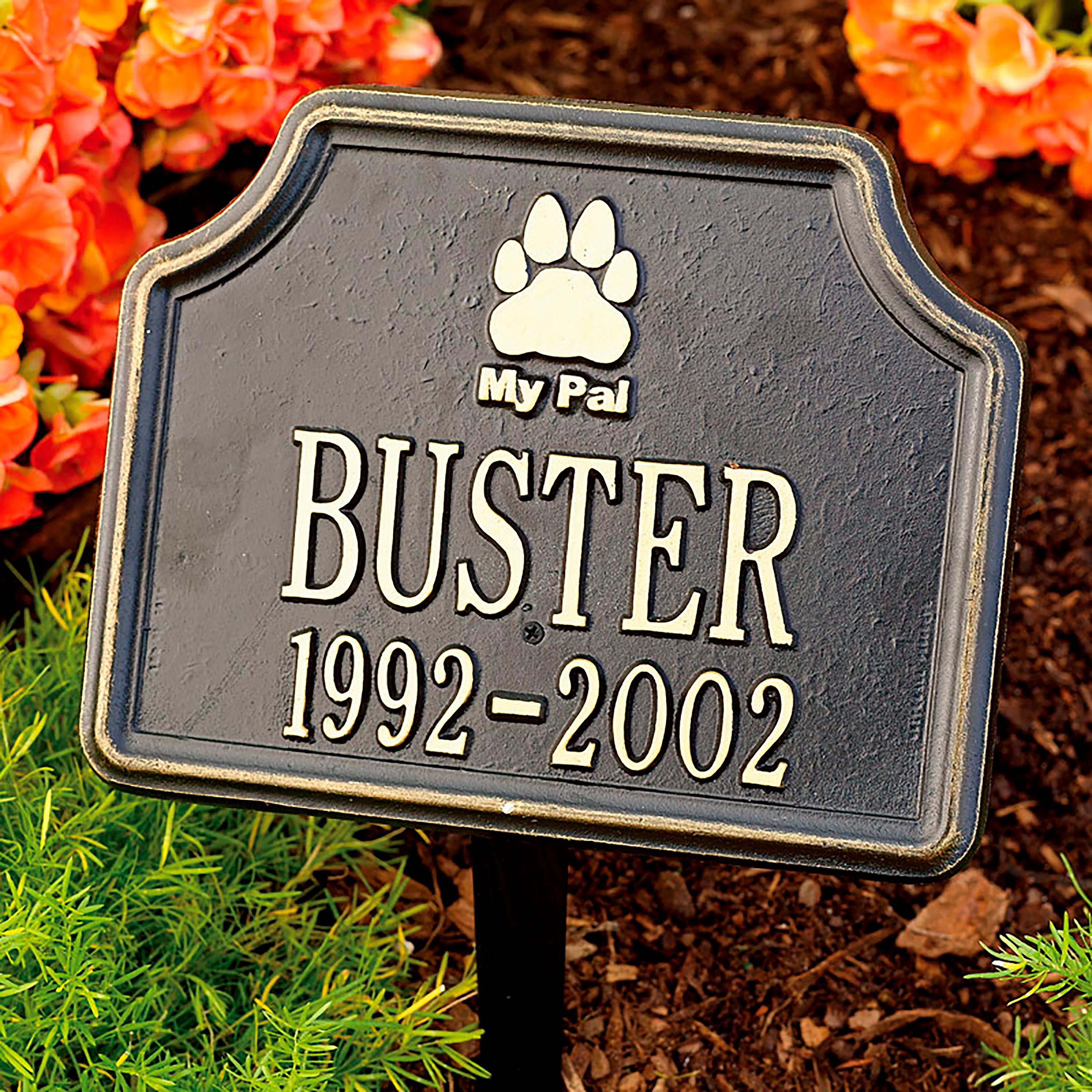 Though the loss of a pet can be devastating, you can pay tribute to your friend with a personalized memorial. Each memorial plaque is crafted of recycled cast aluminum and painted with a durable, weather-resistant finish. My Pal memorial top line holds up to 8 characters; second line holds up to 11 characters. Includes one 12" lawn stake. Made in USA.