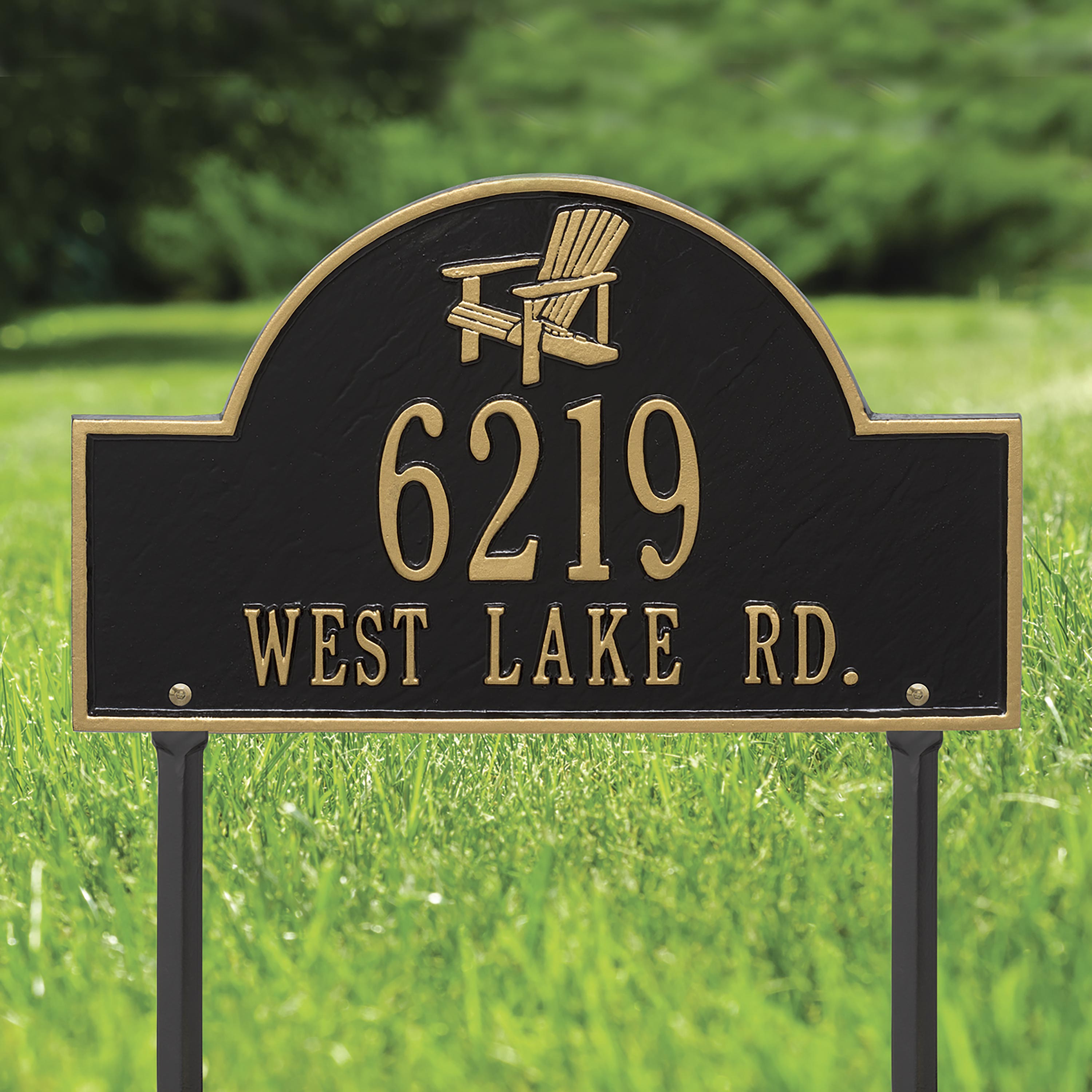 Custom-made in the USA from recycled cast aluminum, our Adirondack Address Lawn Sign suits any home or yard. The sign features raised gold-hued lettering on your choice of background color. Powder-coat finish protects them from the elements. Includes two 18"H stakes with hardware.