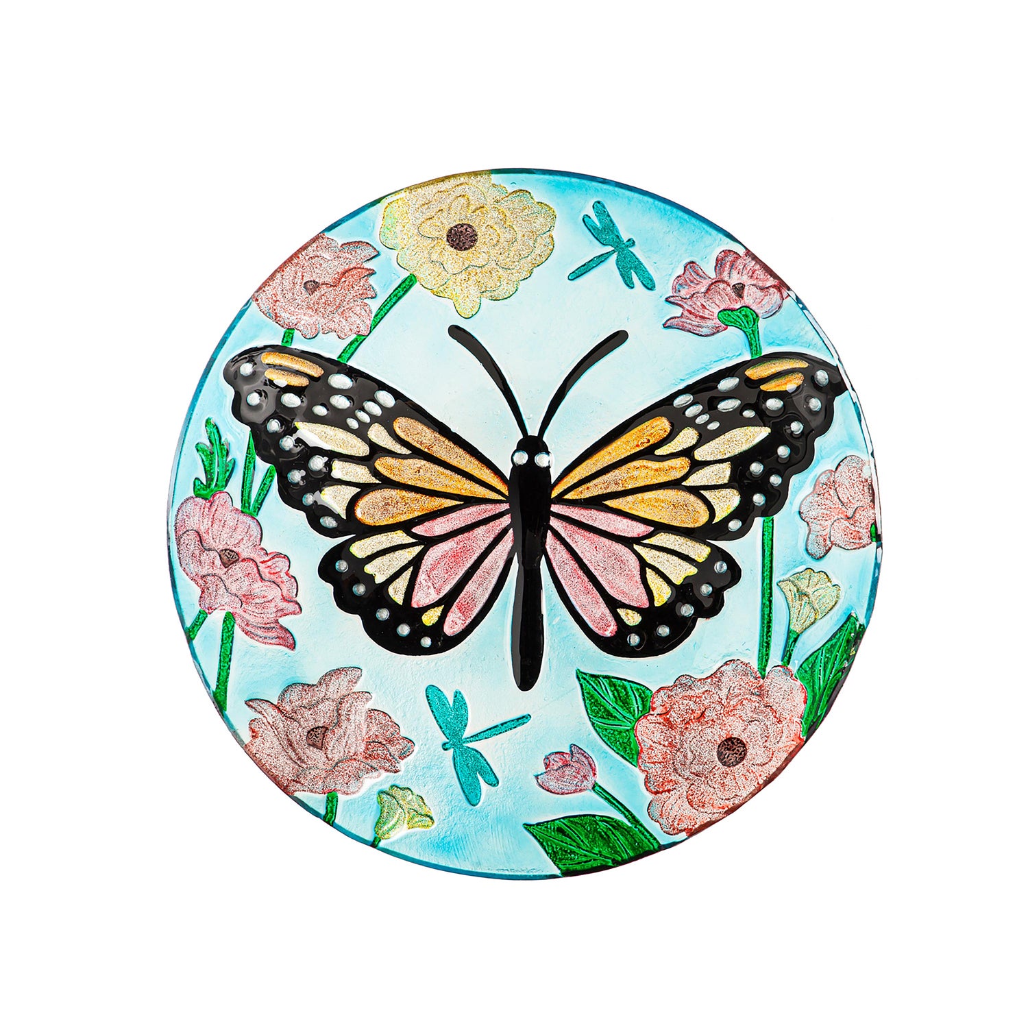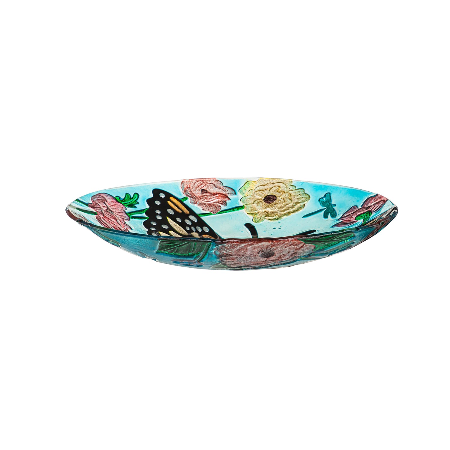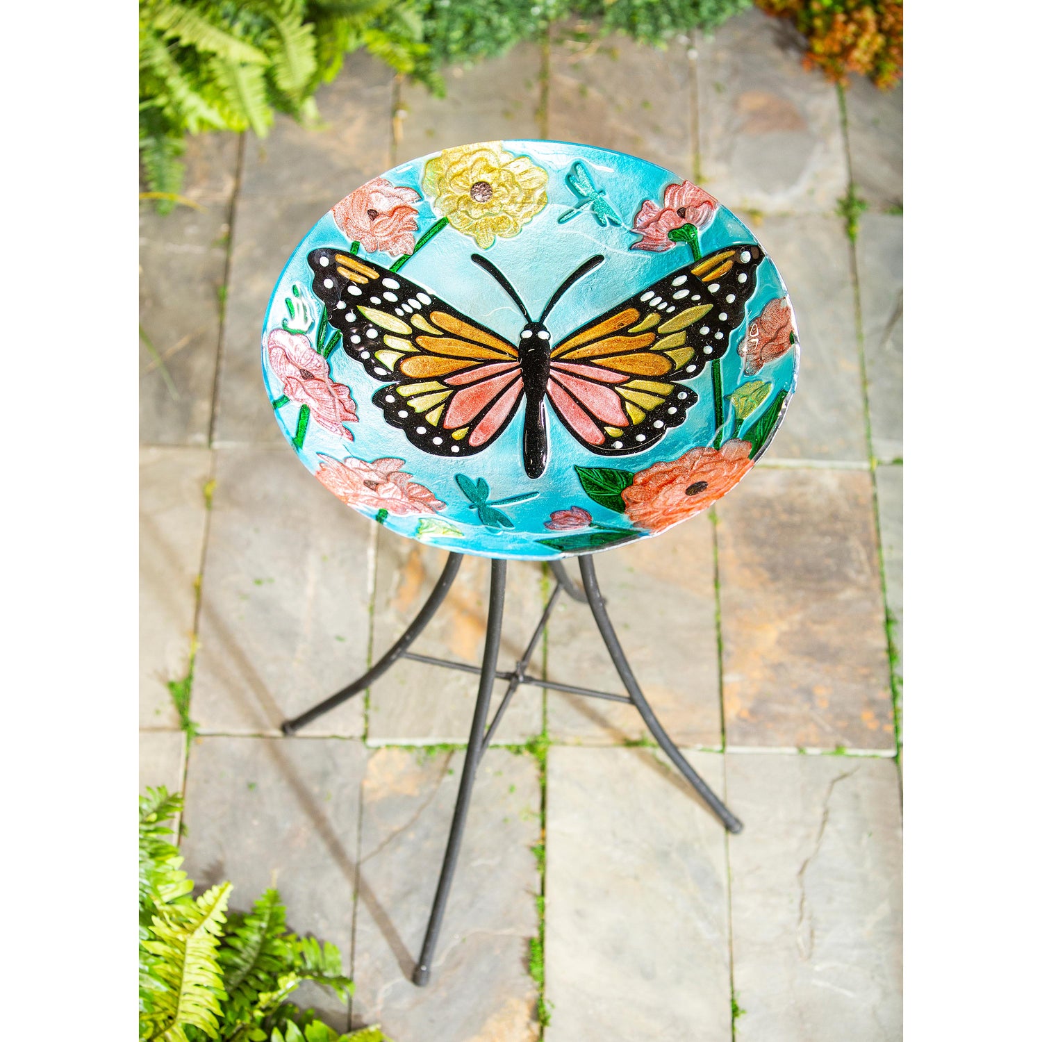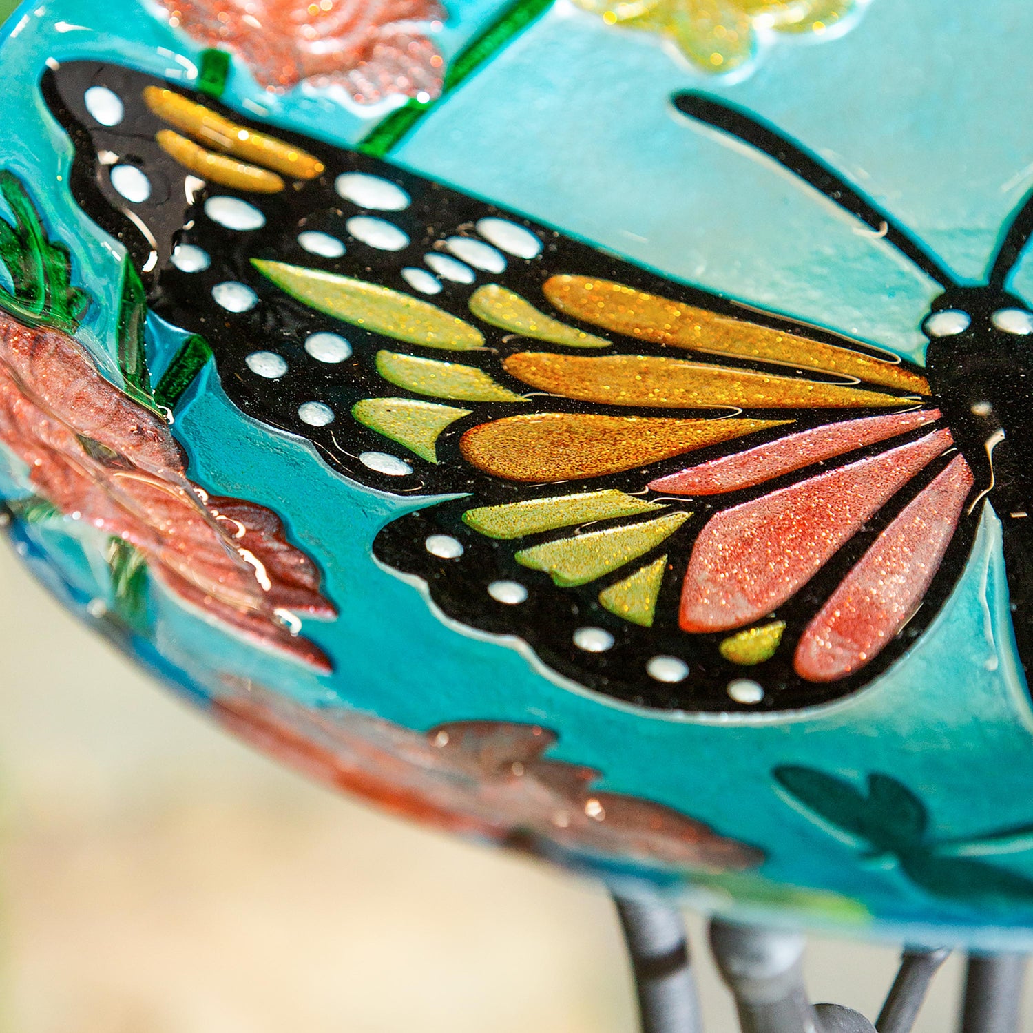 This Hand Painted and Embossed Birdbath boasts glitter details! An intricate butterfly takes center stage in this whimsical design that features floral accents with a sprinkle of glitter. Measuring 18 inches in diameter and boasting hand-painted details, the birdbath holds up to 64 ounces of liquid. Crafted from durable glass, the bowl is outdoor safe and fade-resistant, ensuring it stays vibrant season after season. Capable of attracting birds from near and far, this birdbath will be a great addition to your spring or summer decor. Stand sold separately.