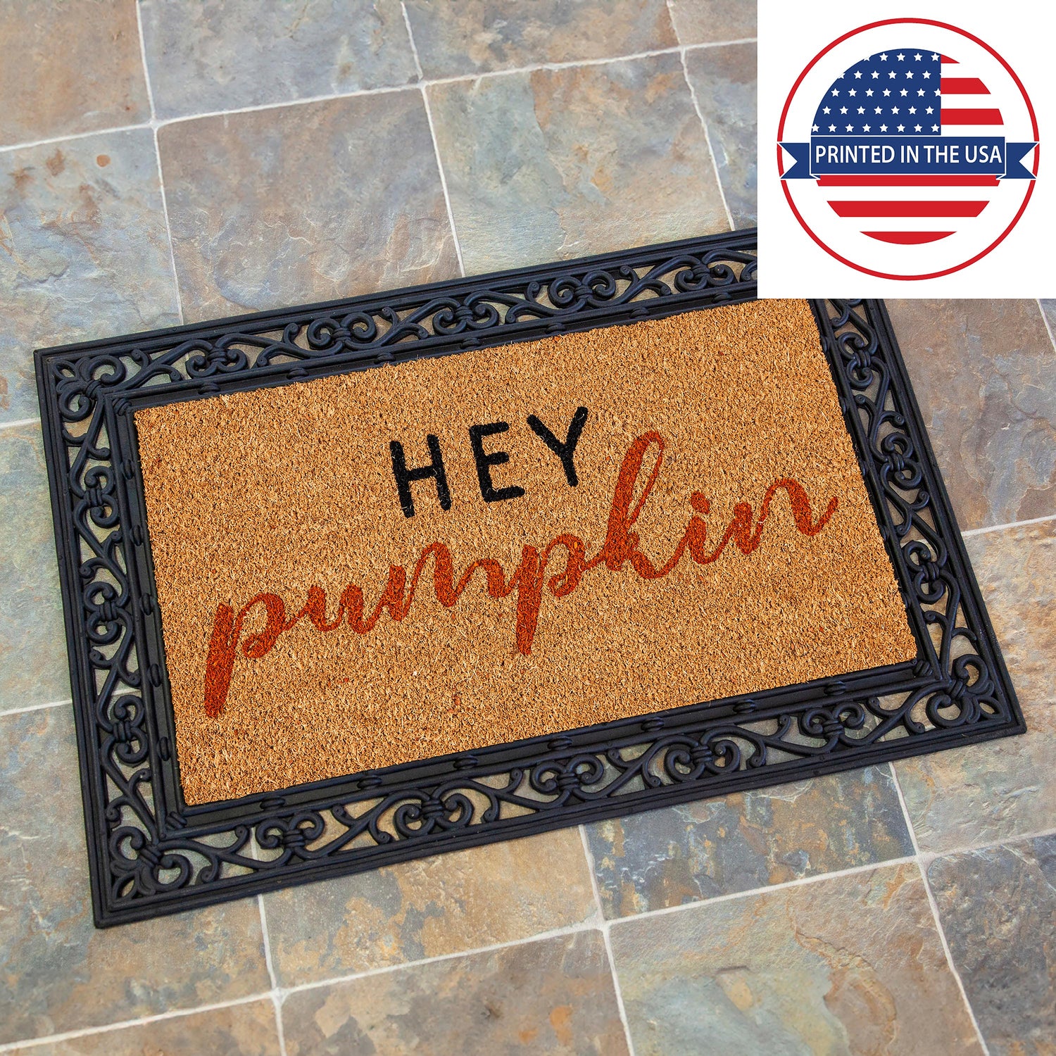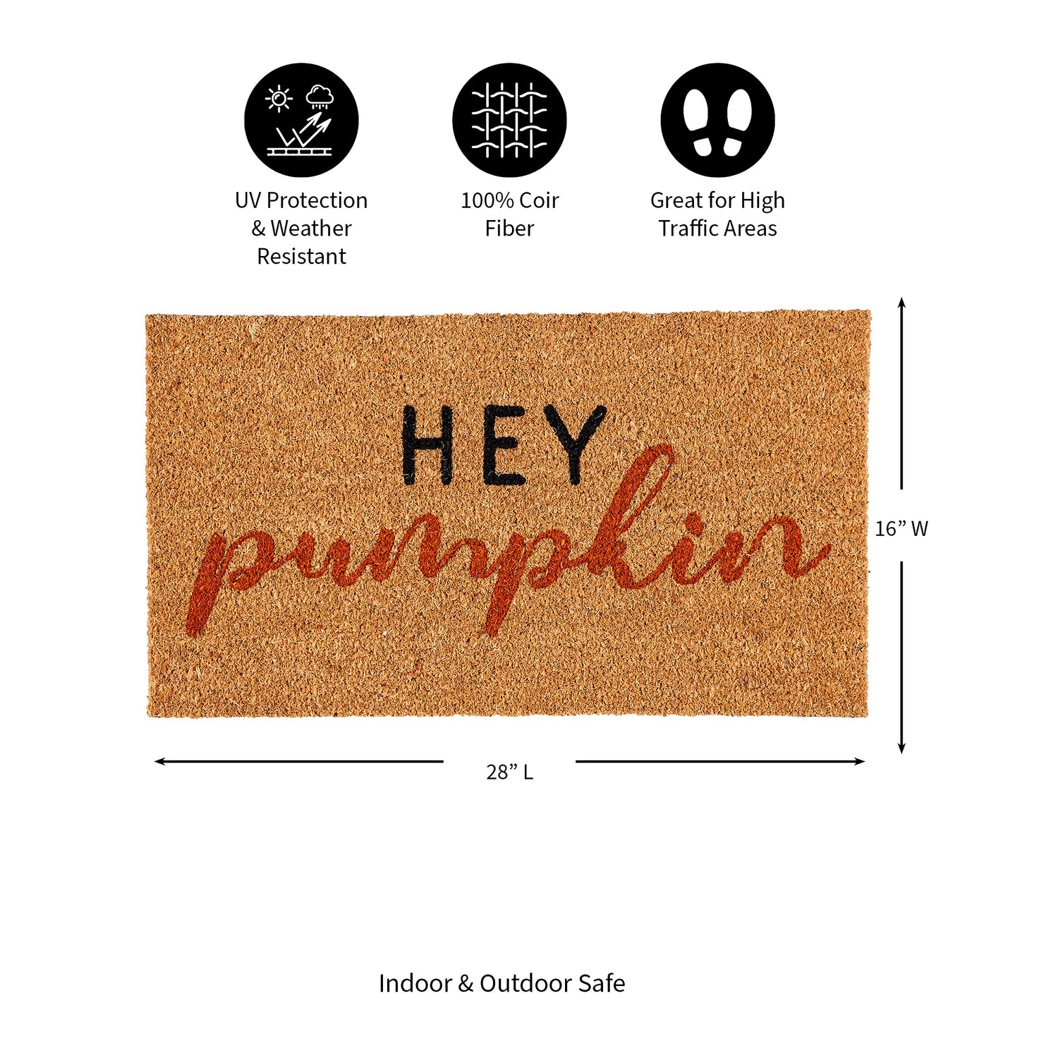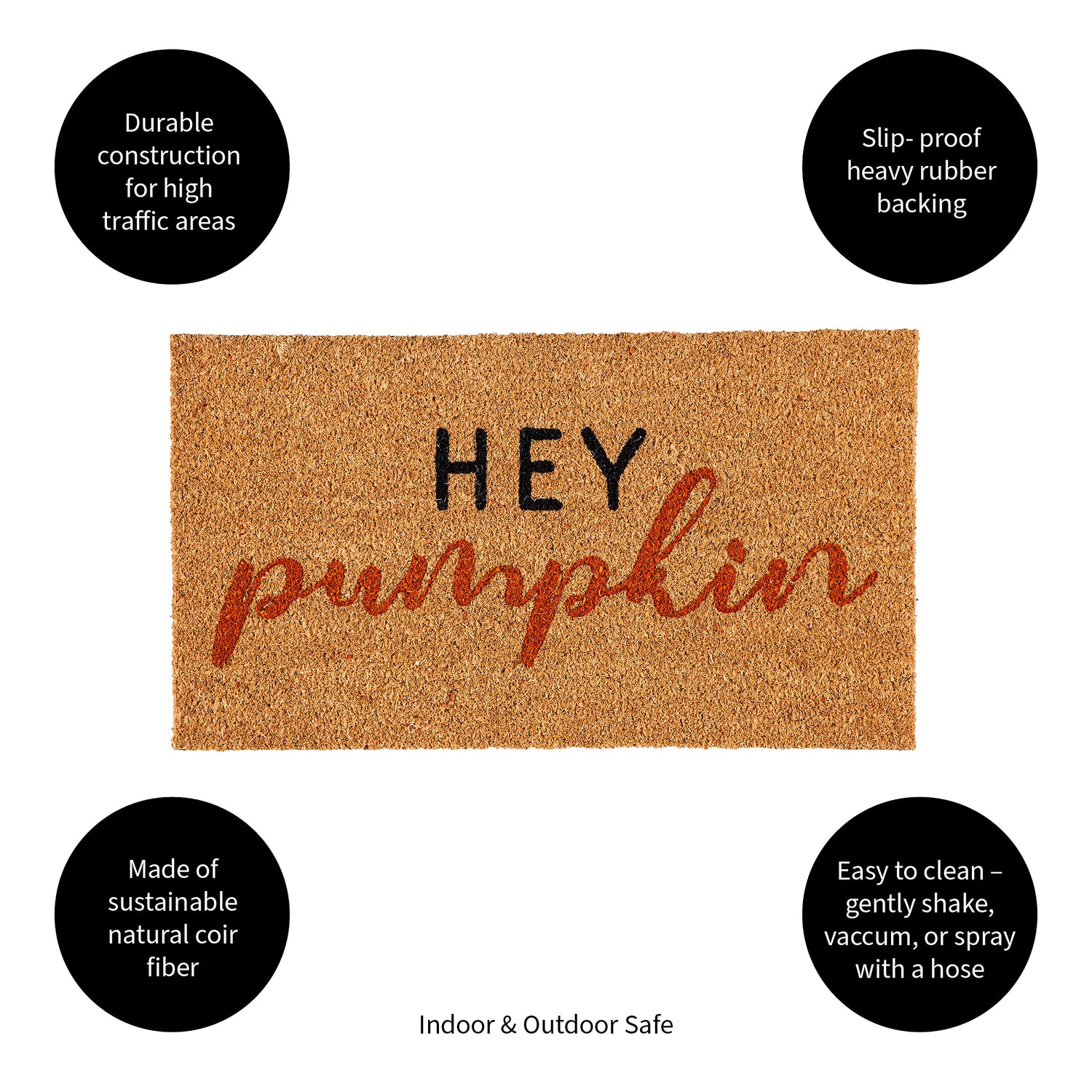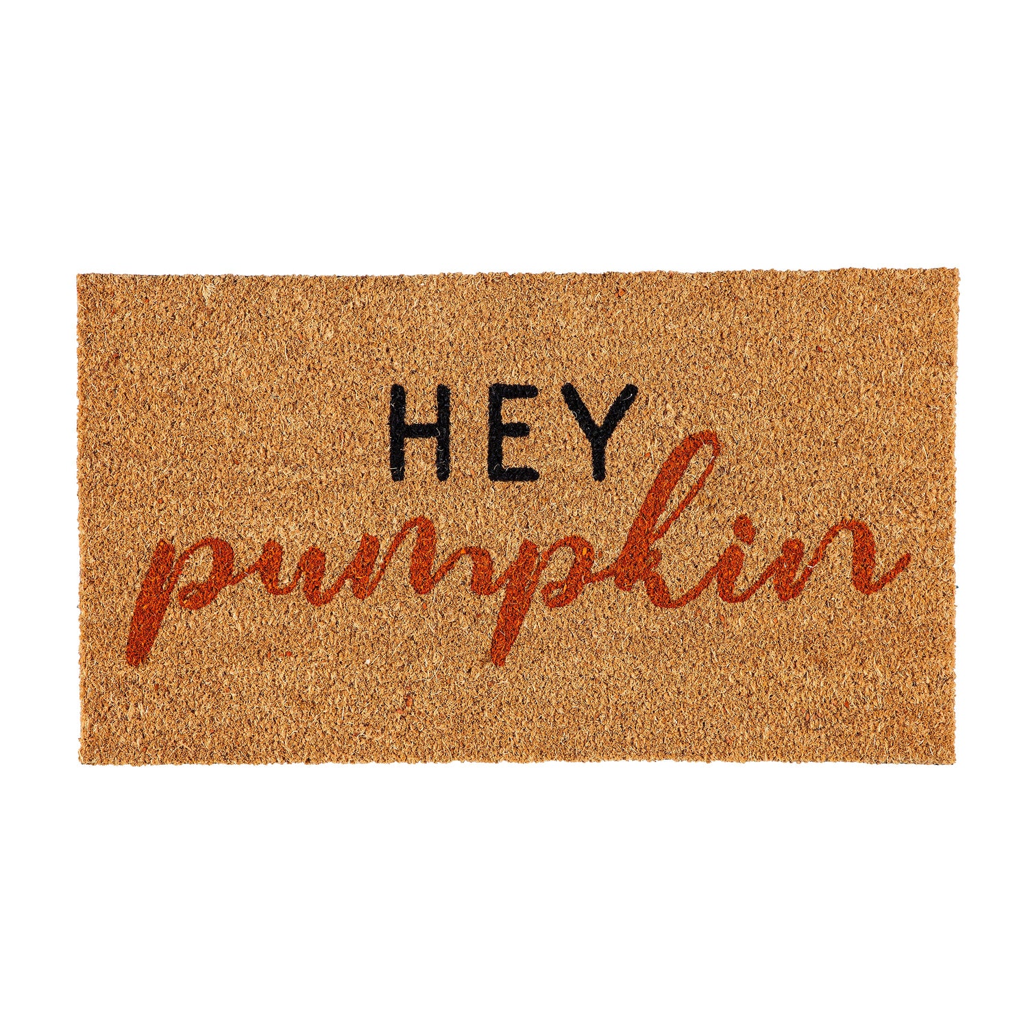 Welcome everyone from family to trick-or-treaters to the home with this coir mat. It features the simple but sweet message "Hey Pumpkin". Crafted from coco husk fiber, this eye-catching mat is natural and eco-friendly. Ideal for high traffic areas, it traps dirt and debris to prevent messes from being tracked into homes. Designs are printed directly on the mats with fade-resistant dyes. Since the mat is crafted from natural coir, some shedding is to be expected. Shake off excess fibers or use a soft brush to gently sweep.