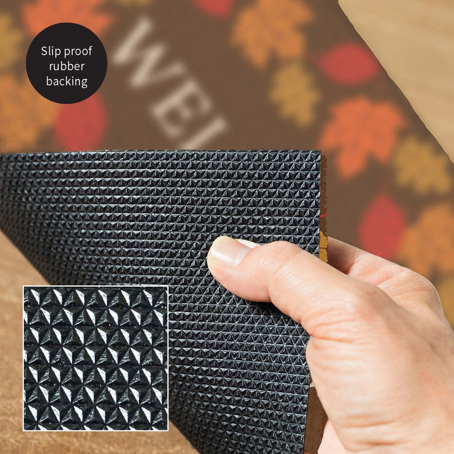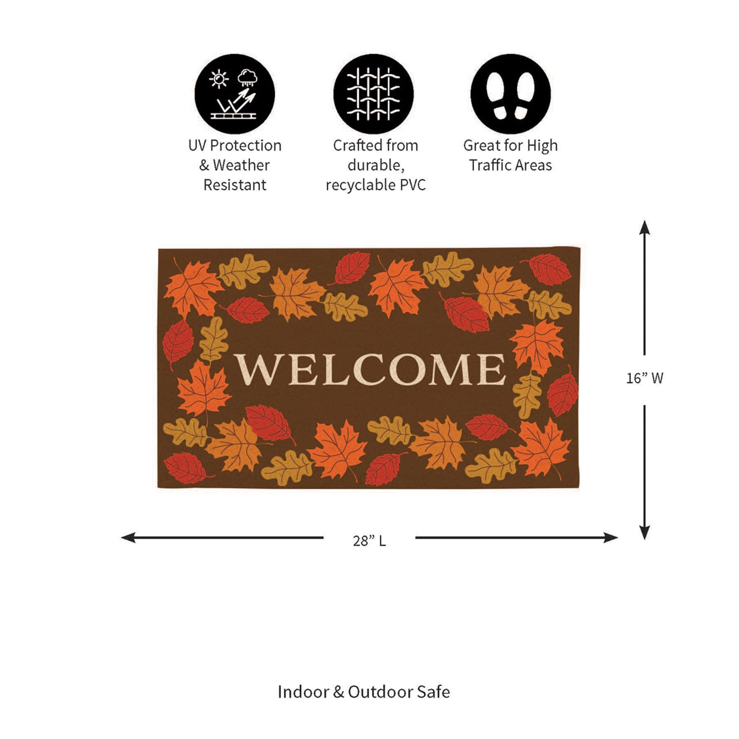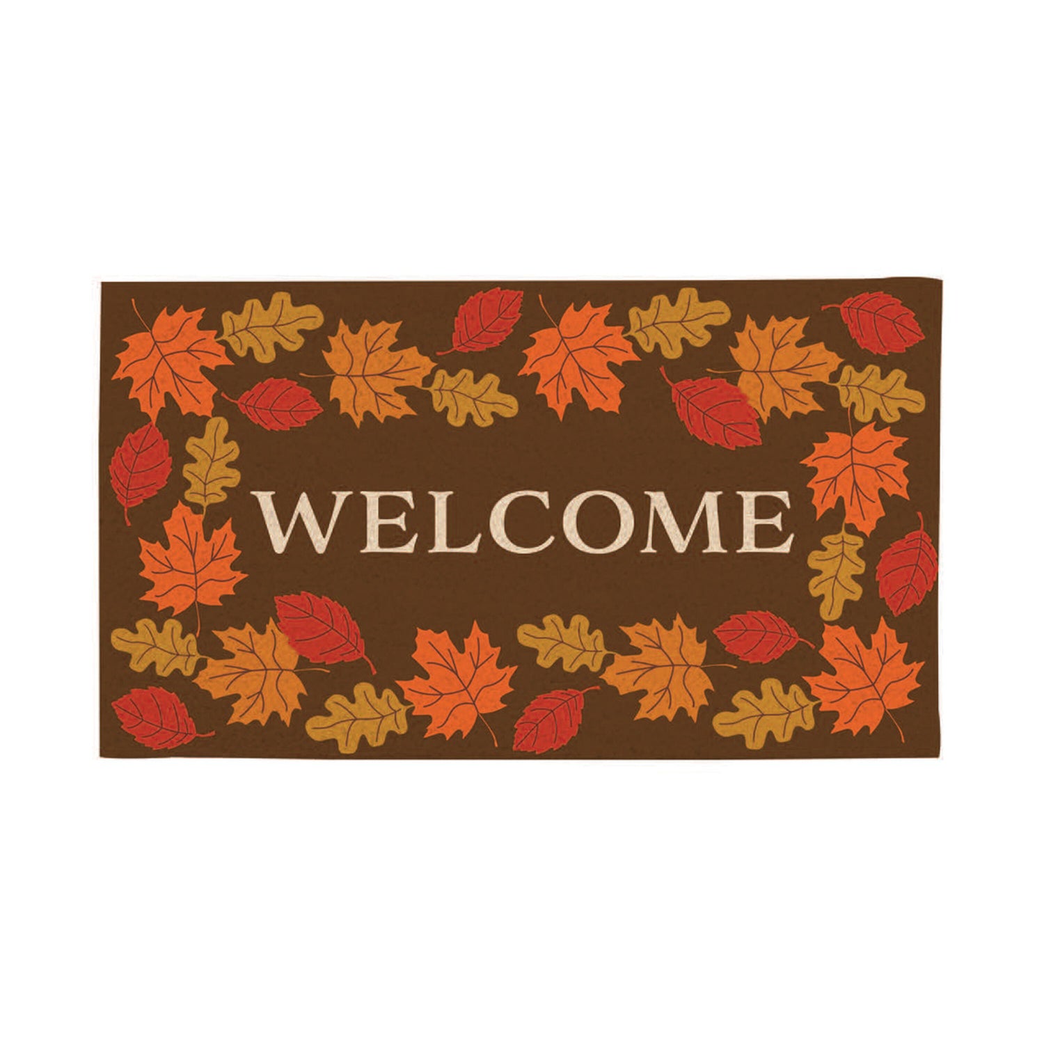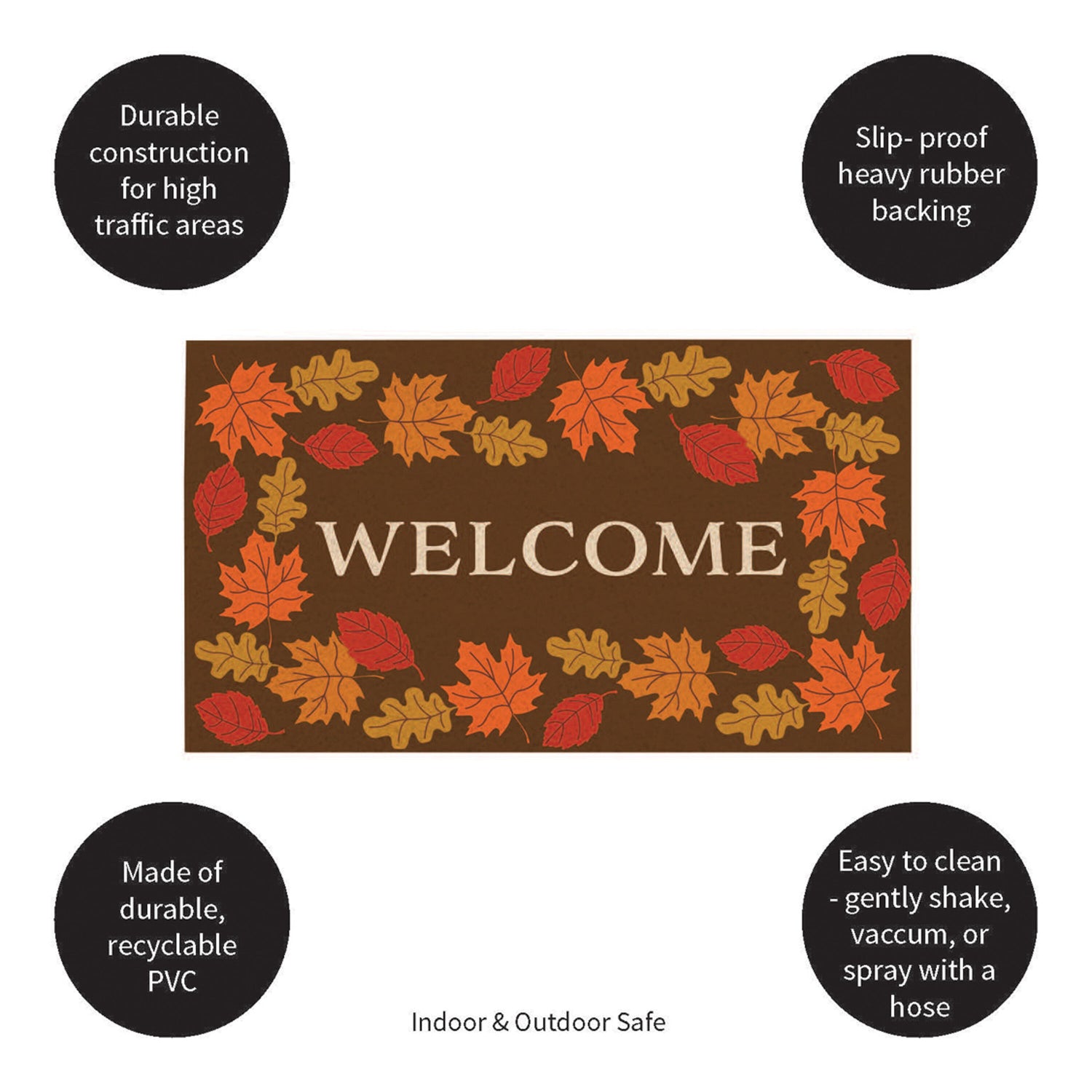 Welcome friends and family to your home with this Trapper Mat. This charming mat features a leaves surrounding a “Welcome” message in a fall color palette of brown, red, and orange. Set it out for the autumn season and delight guests. This eye-catching mat traps dirt and debris to prevent messes from tracked into homes. It’s weather-proof and is made with fade-resistant dyes to last season after season. Made with durable materials, this piece was designed to sit in high-traffic areas. It’s perfect for indoor or outdoor use.