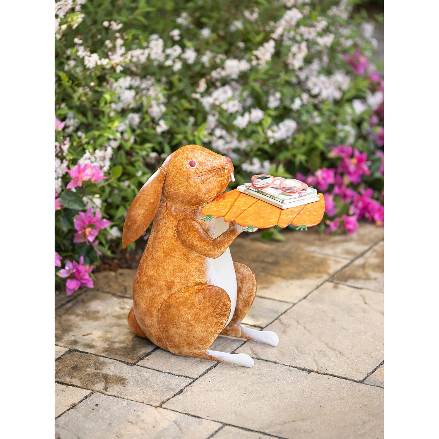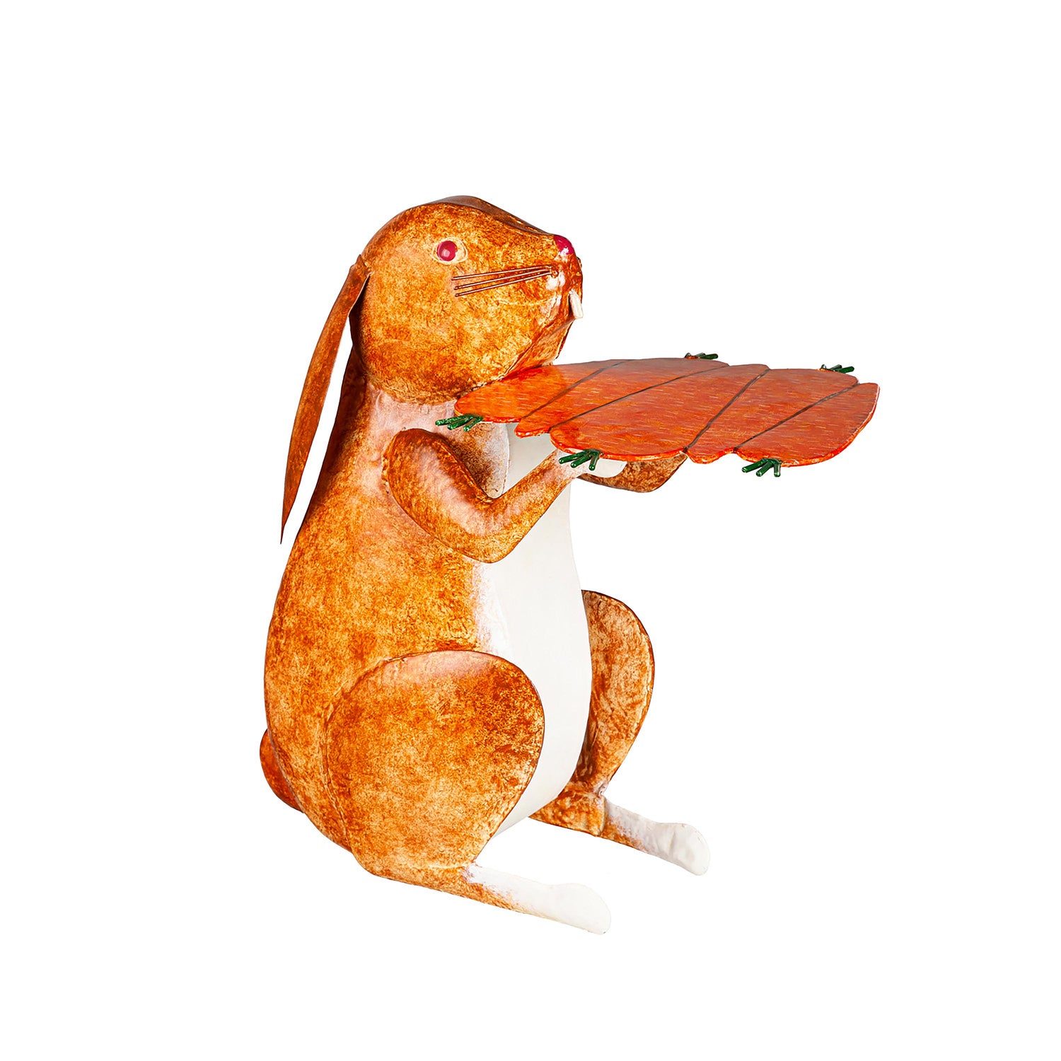 This orange bunny will watch over your drink, book, or snack while making any outdoor space look bright with whimsy! This fun side table makes a functional statement with its carrot tabletop and shaped rabbit design. Crafted of durable metal, the shaped table is ideal for indoor or outdoor use - wherever you need an extra dose of charm. The brushed paints are weather protected to ensure long lasting vibrancy through rain or shine.