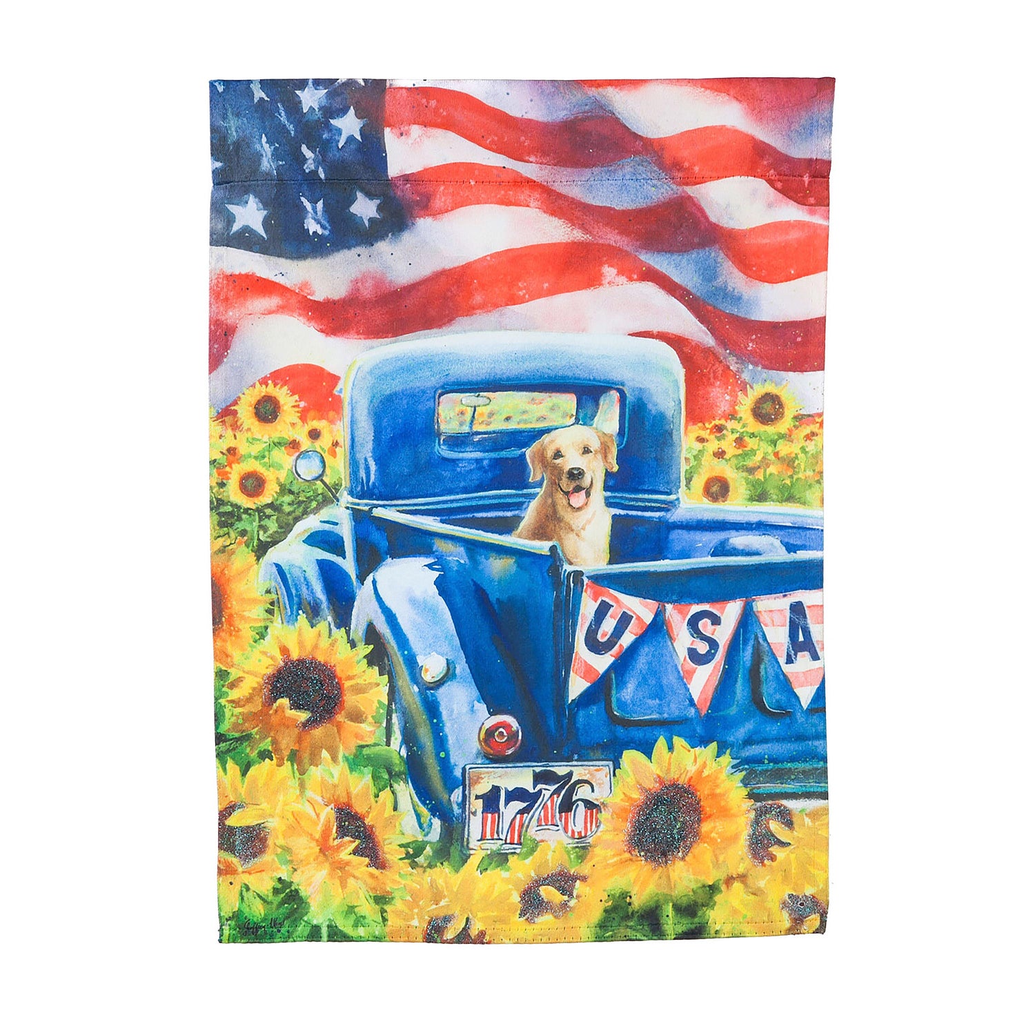 With beautiful color and a festive look, our Patriotic Truck and Dog Suede House Flag is the perfect welcome to your home. The old-style pickup truck, the patriotic elements, pup and sunflowers combine for a star-spangled greeting.