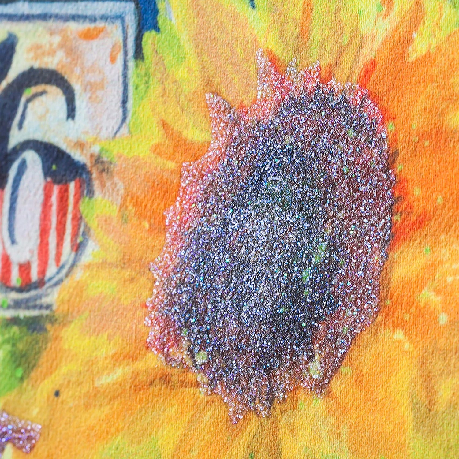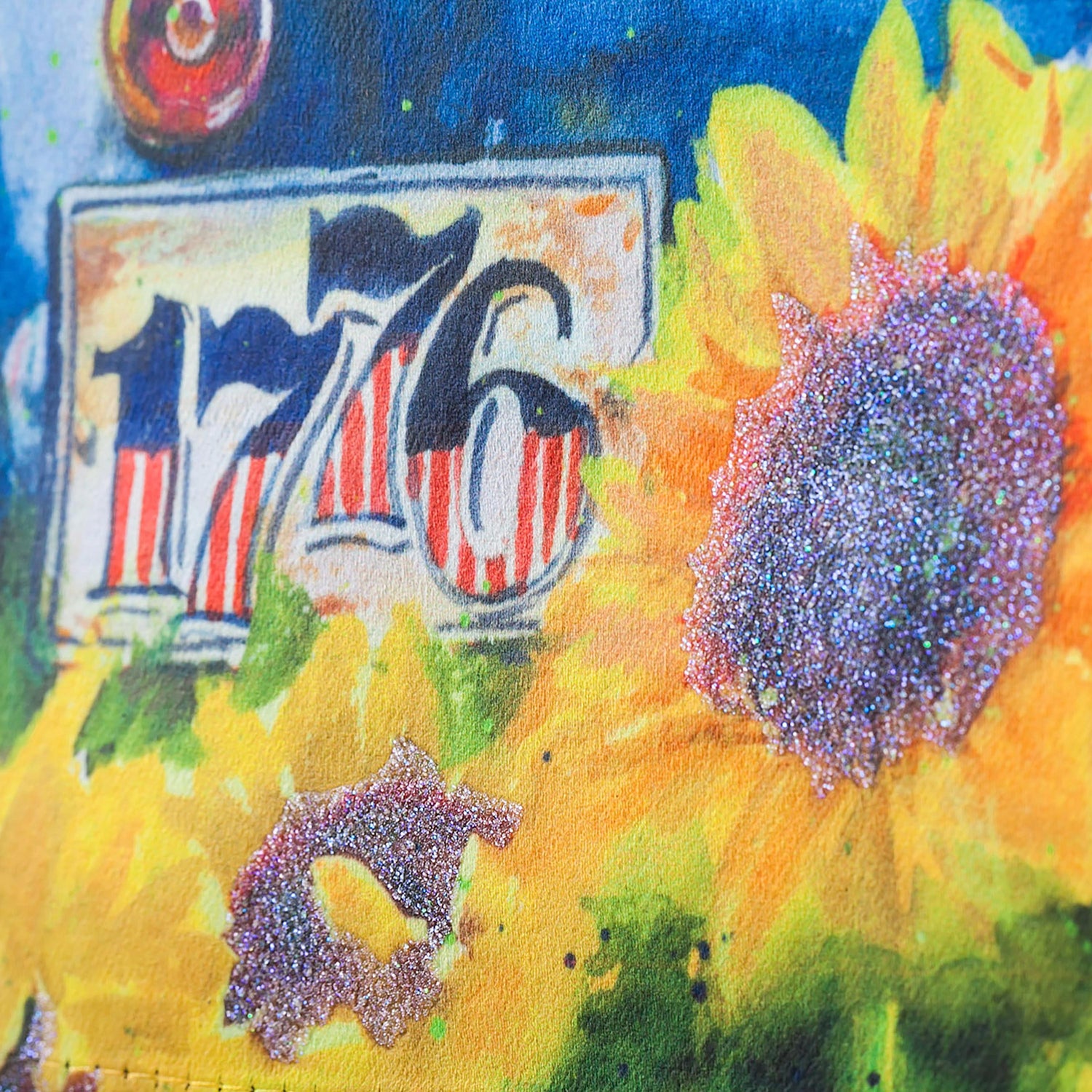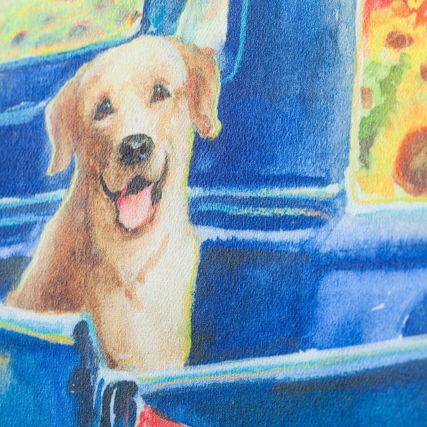 - Features sunflowers, old-style pickup truck, pup and patriotic elements