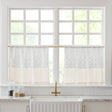 This charming kitchen tier set features an attached valance with eyelet embroidery and scalloped edges and is great in a country cottage style home. The cotton valance overlays a textured linen blend panel. These cafe curtains provide moderate privacy and allowing some light to pass through. Sold as 2 panels, each measuring 29 inches wide by 24 inches long. Easy to install with a 1.5" rod pocket, to slide onto a curtain rod or by using clip rings (not included). Machine washable for easy care.