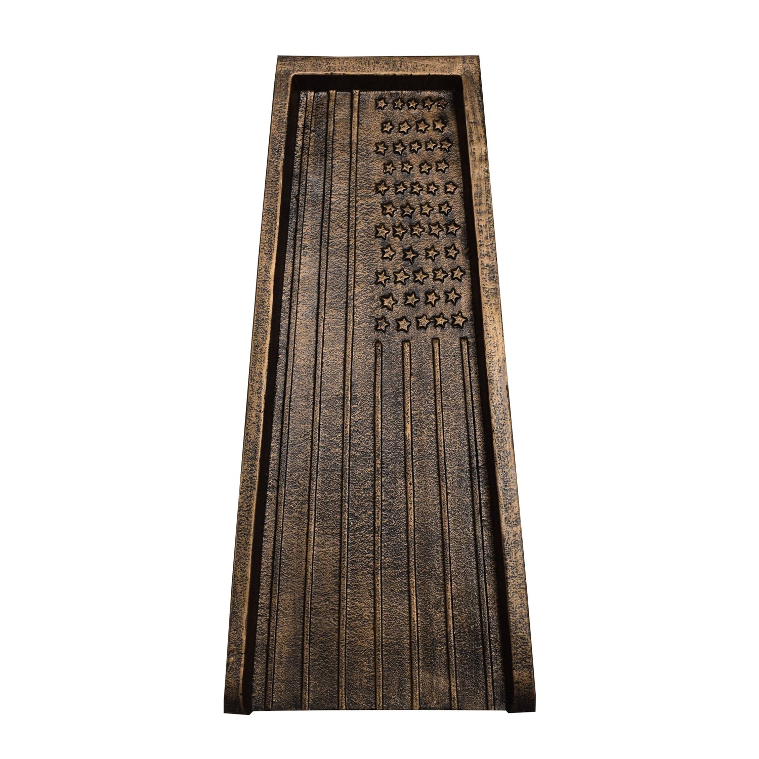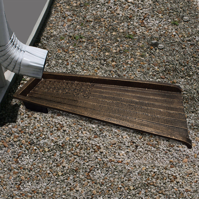 Efficient Rainwater Diversion: Safeguard your home's foundation with the Bronze USA Patriotic Flag Cast Aluminum Downspout Gutter 24 in. Splash Block. Its expertly designed angled pitch ensures rainwater is efficiently redirected away from your foundation, protecting it from potential damage.