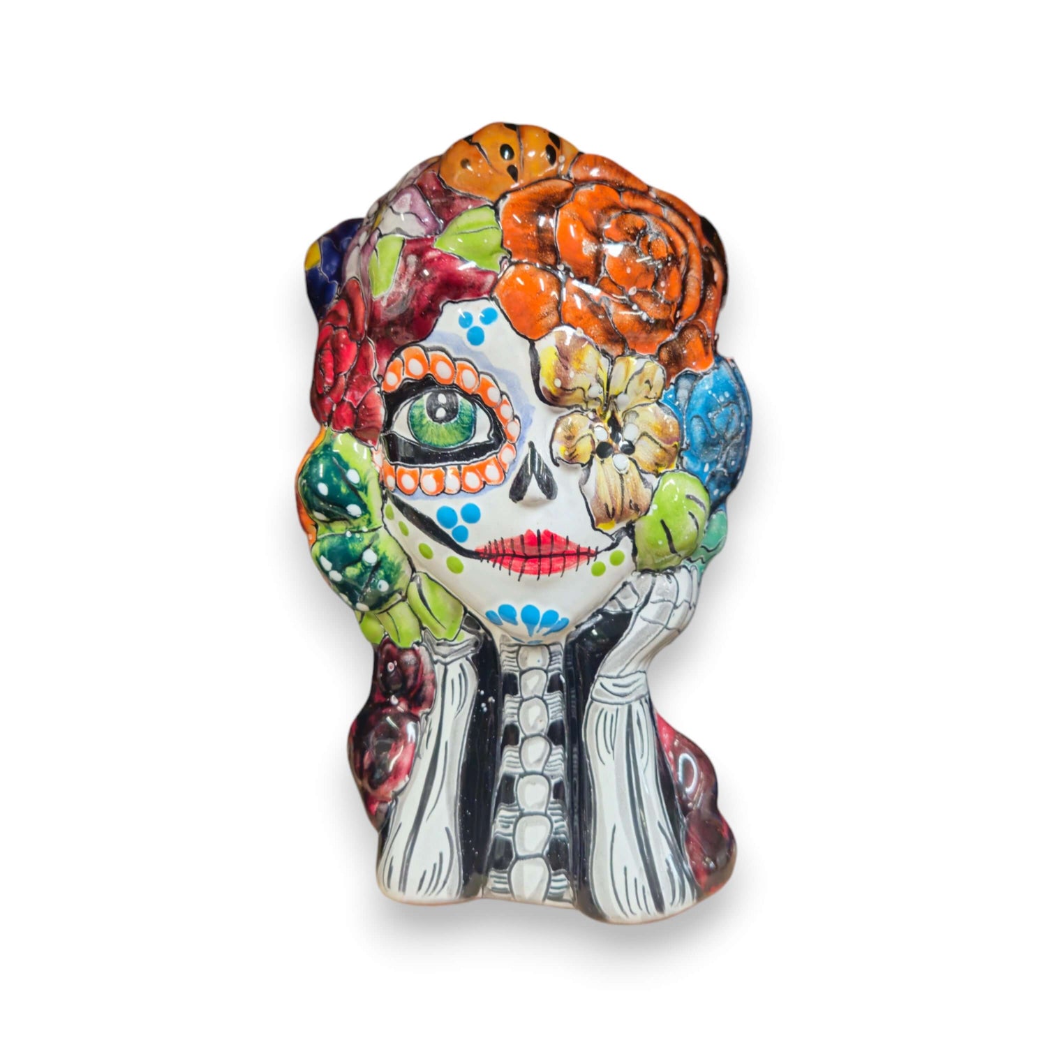 Style: A striking Day of the Dead skull planter adorned with vivid floral motifs in red, green, blue, and yellow. The expressive face and detailed brushwork bring a festive, artistic touch to any decor.