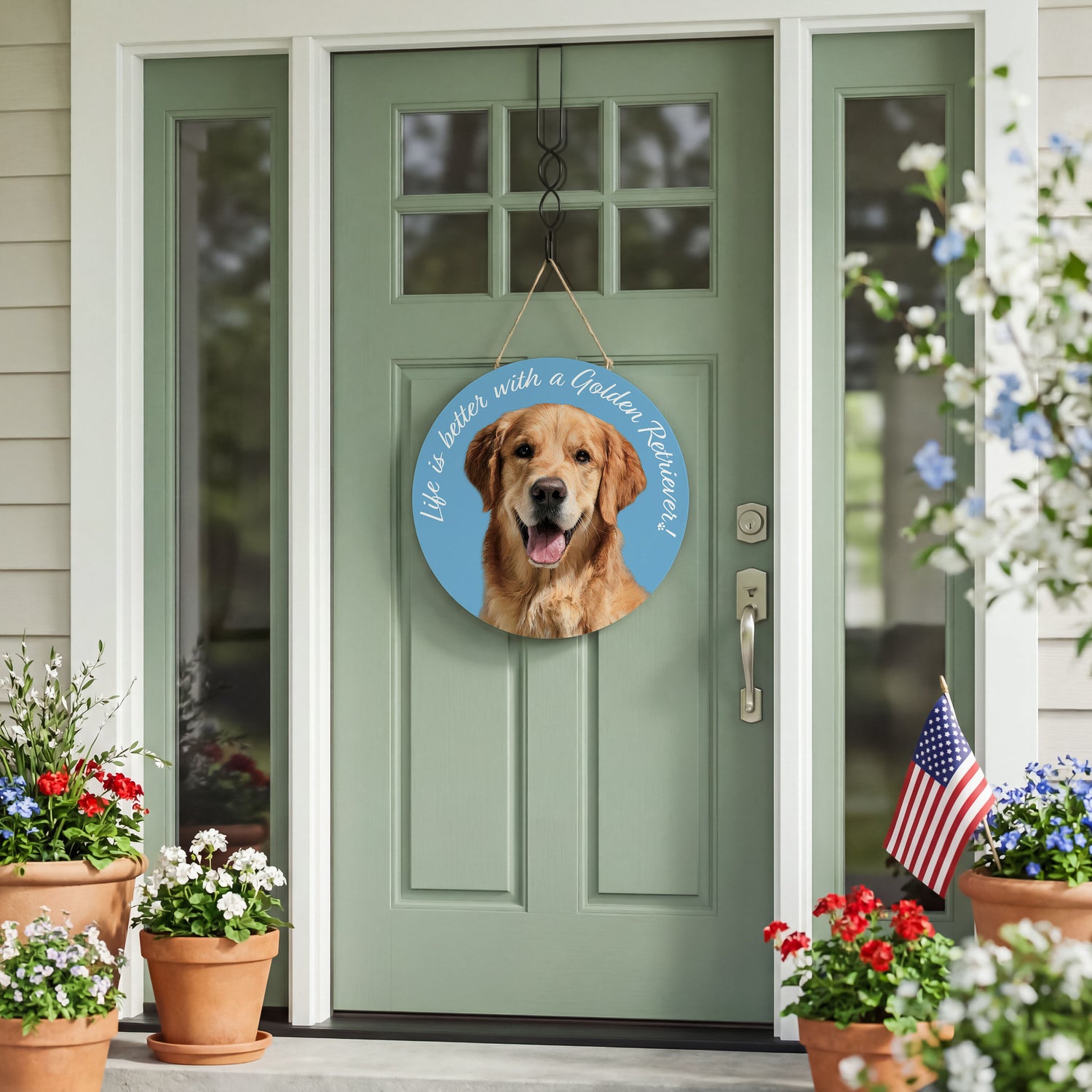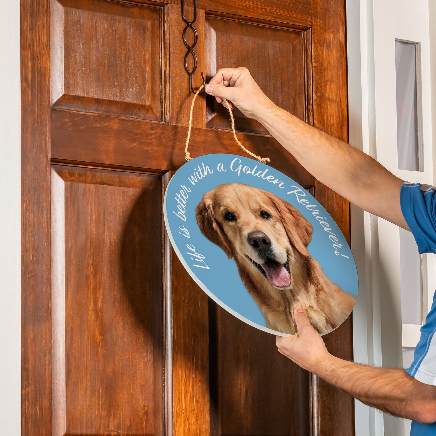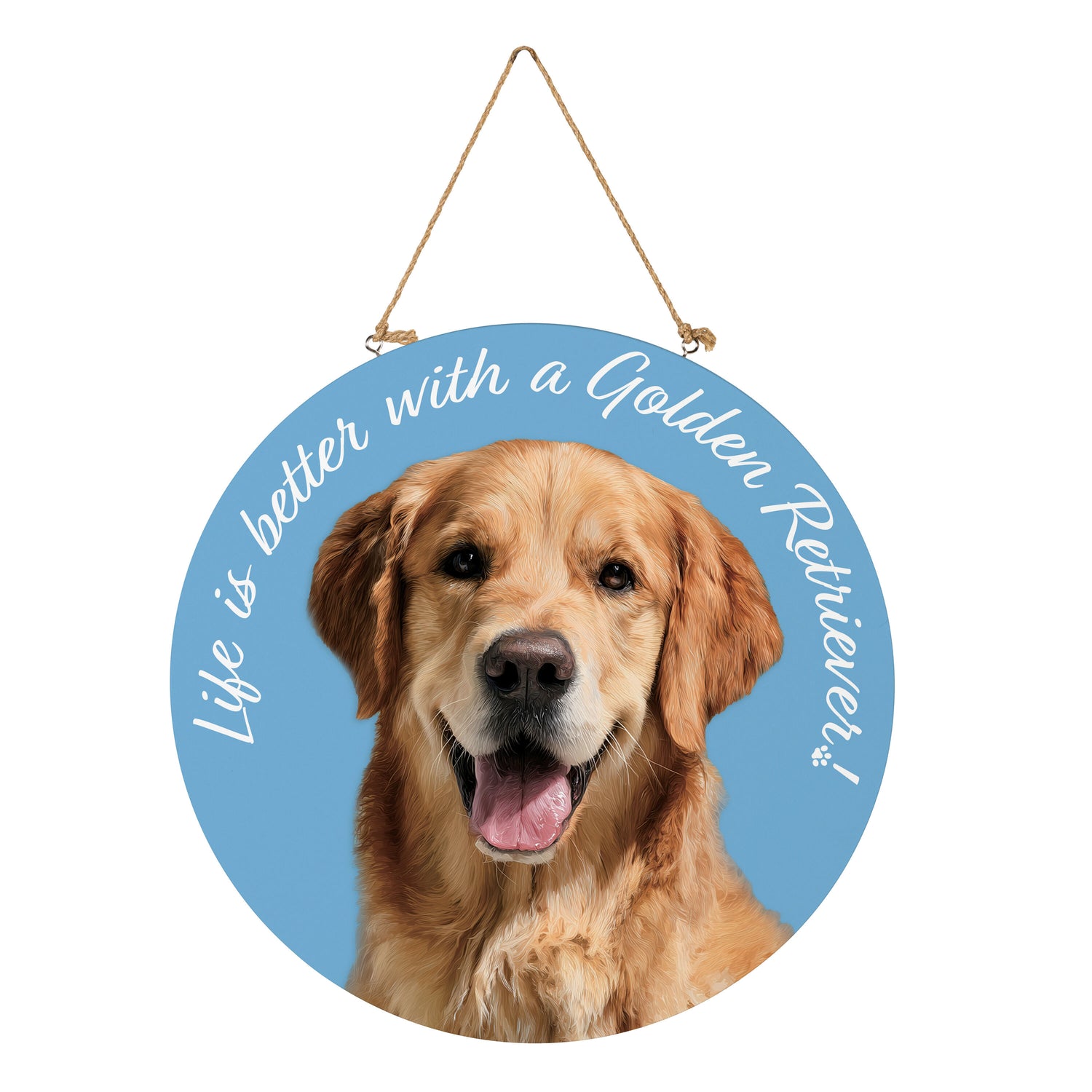 This 18-inch round wood door sign celebrates the beloved Golden Retriever with a warm, welcoming graphic that instantly personalizes any entryway. The clean circular silhouette and natural wood construction offer a classic, versatile look on the door, while the bold 18-inch scale delivers statement-making presence without overpowering the space. Ideal for breed enthusiasts and gifting displays alike, this approachable design is an easy merchandising add that reads as a thoughtful dog lover gift or a meaningful gift for dog owners—bringing friendly personality to everyday hellos.