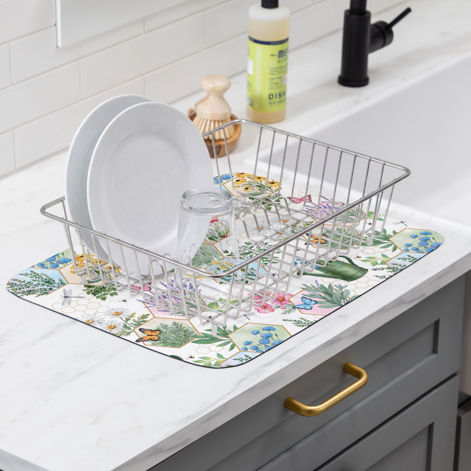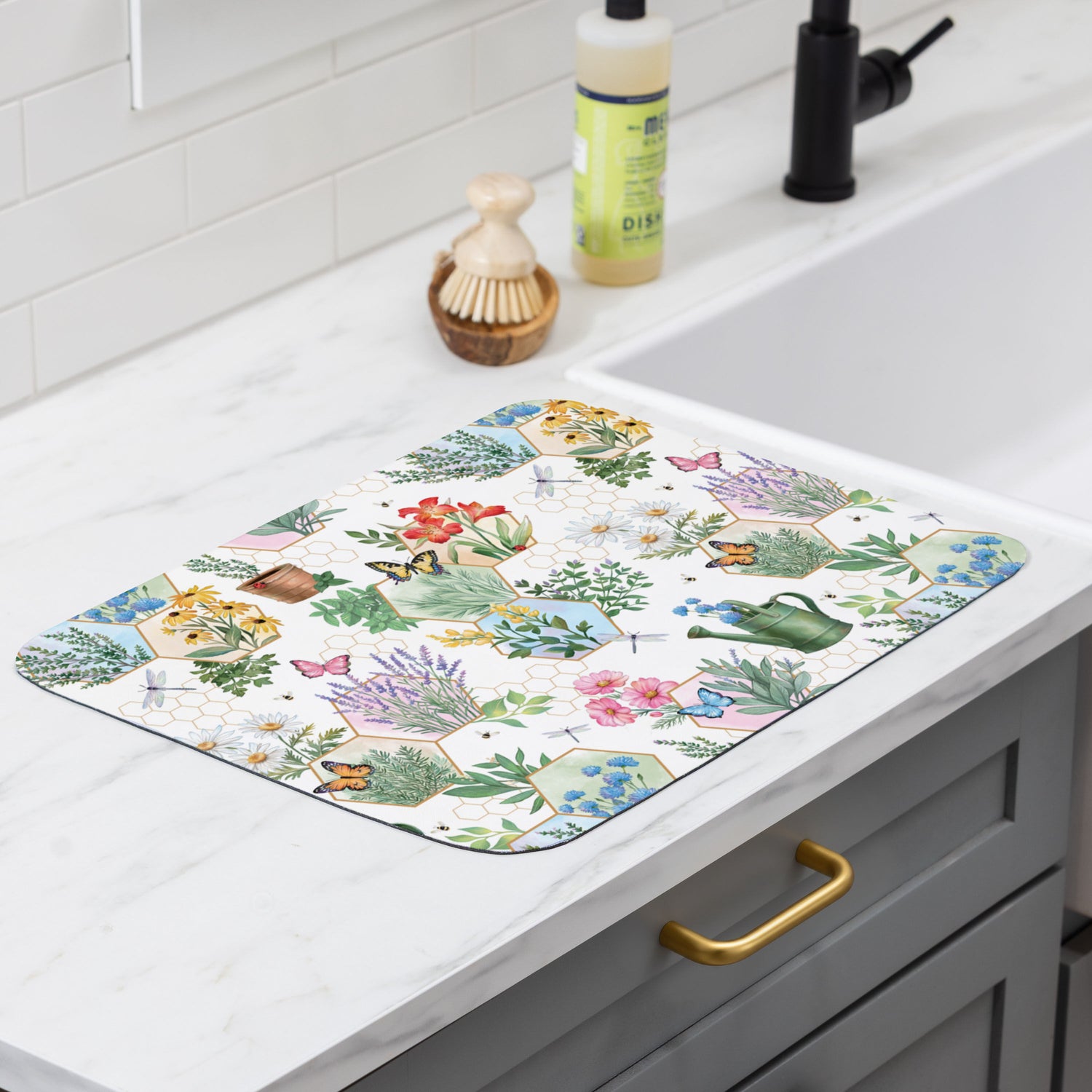 The Cottage Garden Drying Mat brings a fresh, gardening-inspired look to everyday cleanup while providing a dedicated surface for air-drying dishes, glassware, and utensils. Sized at 20 x 15 inches, this dish drying mat fits comfortably on most kitchen countertops, helping contain drips and protect surfaces without crowding prep space. The cottage garden artwork adds a charming accent that complements farmhouse and nature-inspired kitchens, making it an easy upsell alongside seasonal towels and sink accessories. Purpose-built for daily use, this drying mat keeps cleanup simple and the kitchen looking pulled together—ideal for shoppers seeking functional design with decorative appeal.