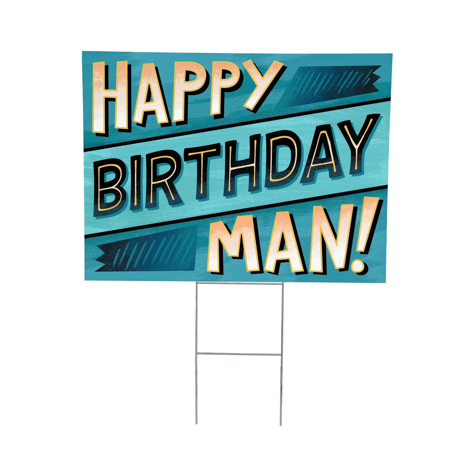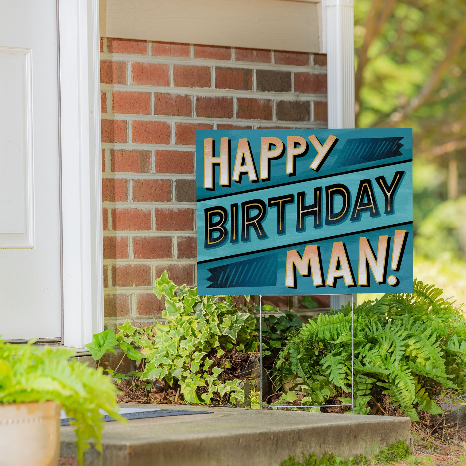 - 24 x 18 inch yard sign with “Happy Birthday Man!” message and cake theme for standout visibility