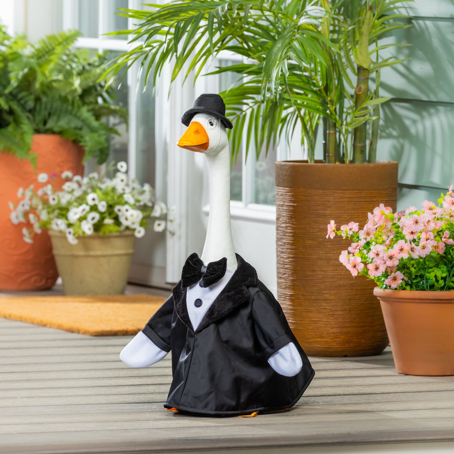 Bring a whimsical charm to the front porch or garden with this Metal Porch Goose Statue. Crafted with rustic details and durable metalwork, this goose adds a cheerful personality to any outdoor décor. Whether dressed for the season or standing solo, it’s a delightful conversation starter. Perfect for year-round display and easy to accessorize with themed outfits. No outfits are included in this product