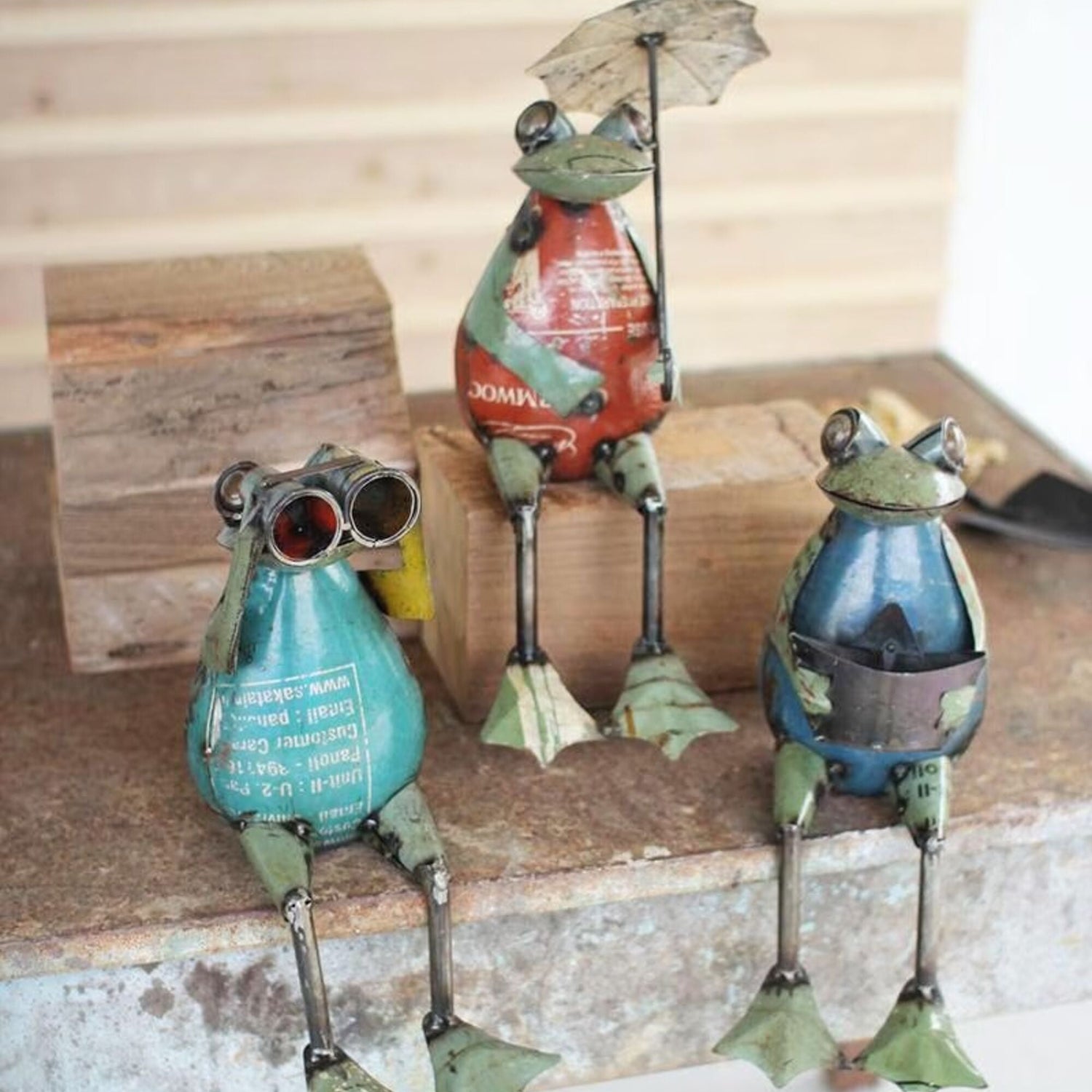 Recyled Metal Frog Garden Statue, Set of 3