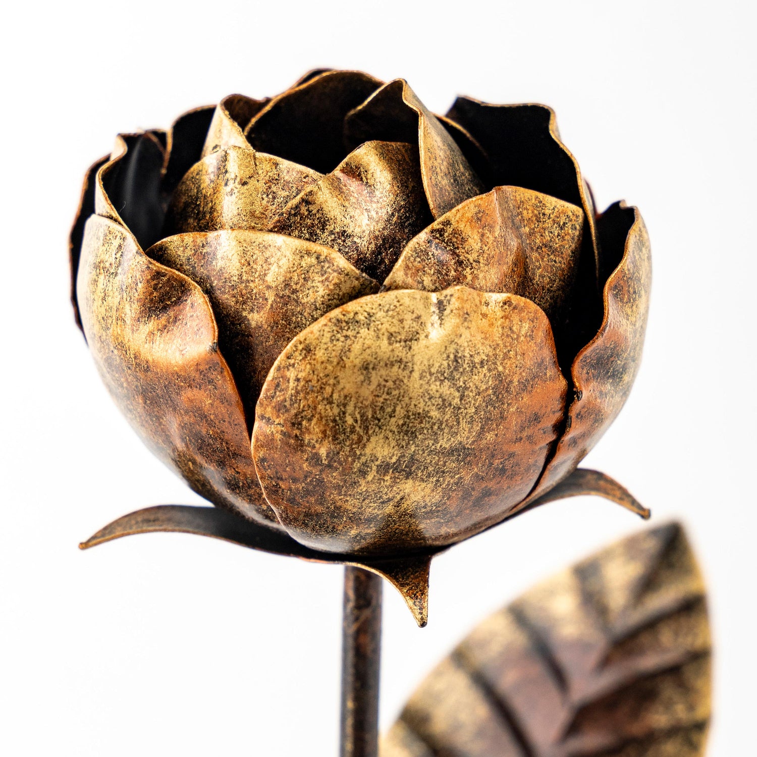 These Metal Rose Garden Stakes with Copper-Gold Finish add instant elegance to your yard or garden. Their handmade quality can be seen in every detail from their layered petals to their lifelike leaves. Each has been handcrafted by our artisan partners who take metal and form it into stunning works of beauty and art.