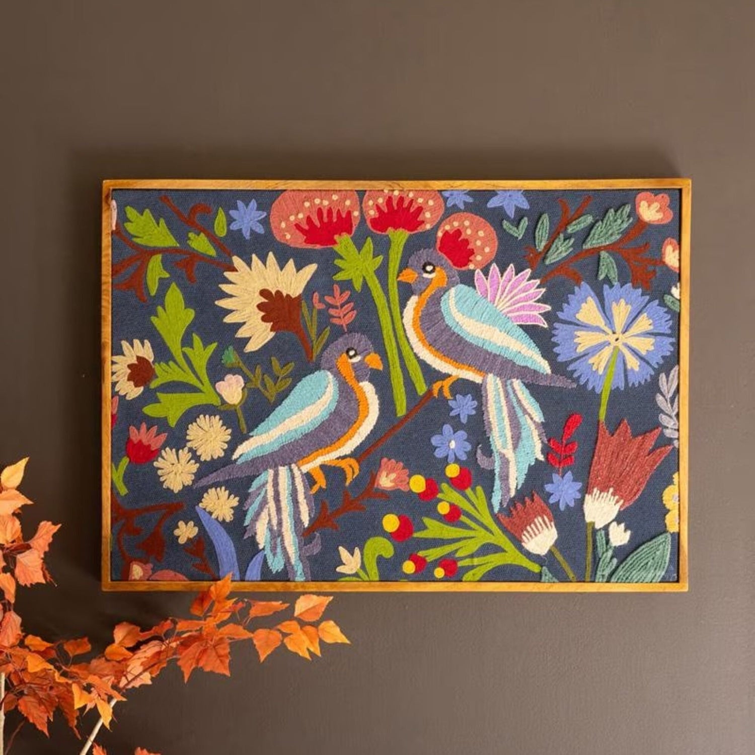 Bring color, texture, and artisan charm to your walls with this beautifully hand-hooked bird and floral design. Featuring two delicately detailed birds nestled among vibrant blooms and foliage, this piece captures a whimsical, nature-inspired scene with a rich, tactile finish.The intricate hooked texture adds depth and warmth, while the bold yet balanced color palette makes it a standout accent for any room. Framed for a clean, finished look, it’s perfect for adding personality to living spaces, bedrooms, or entryways.