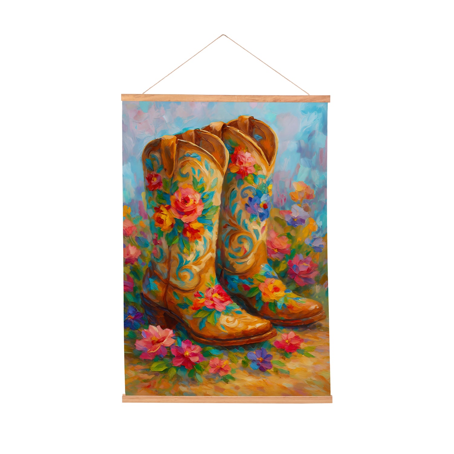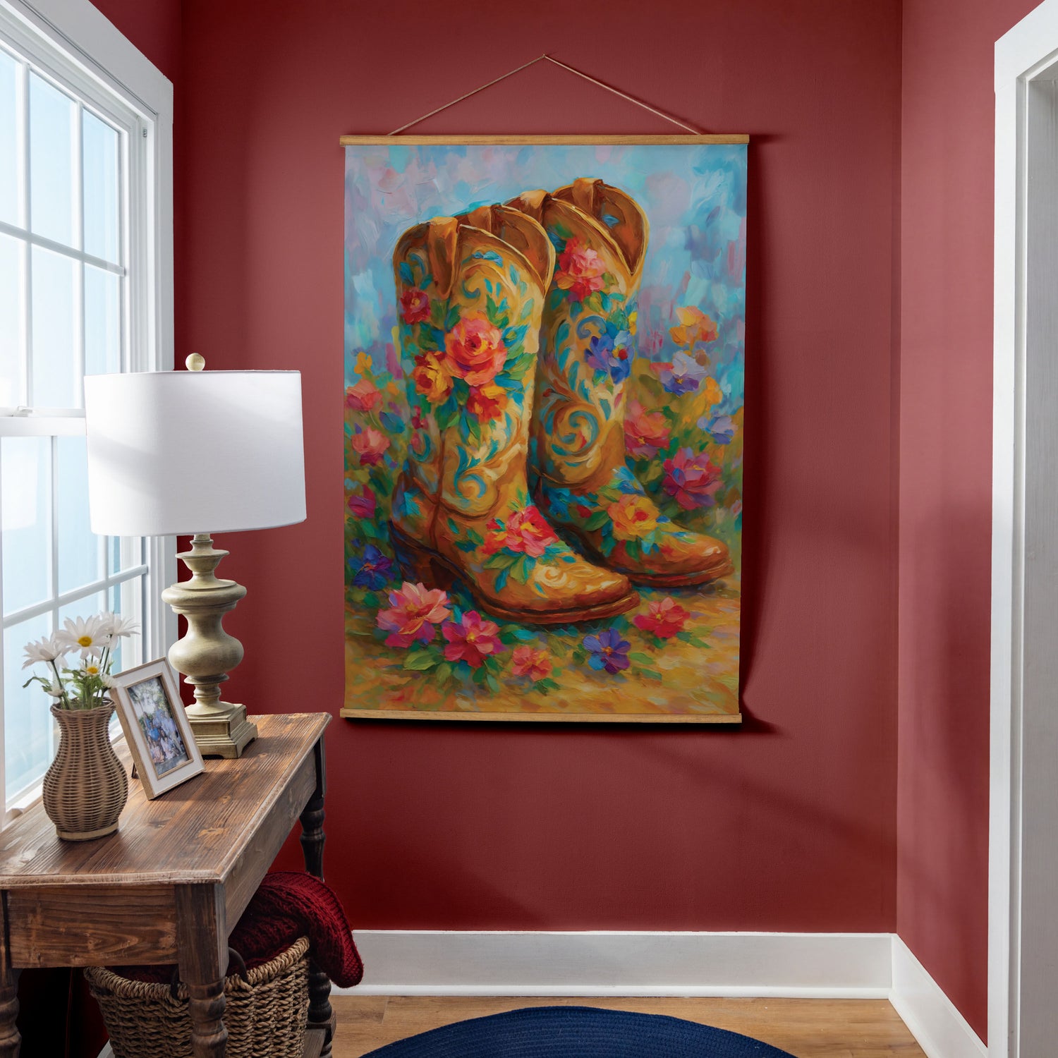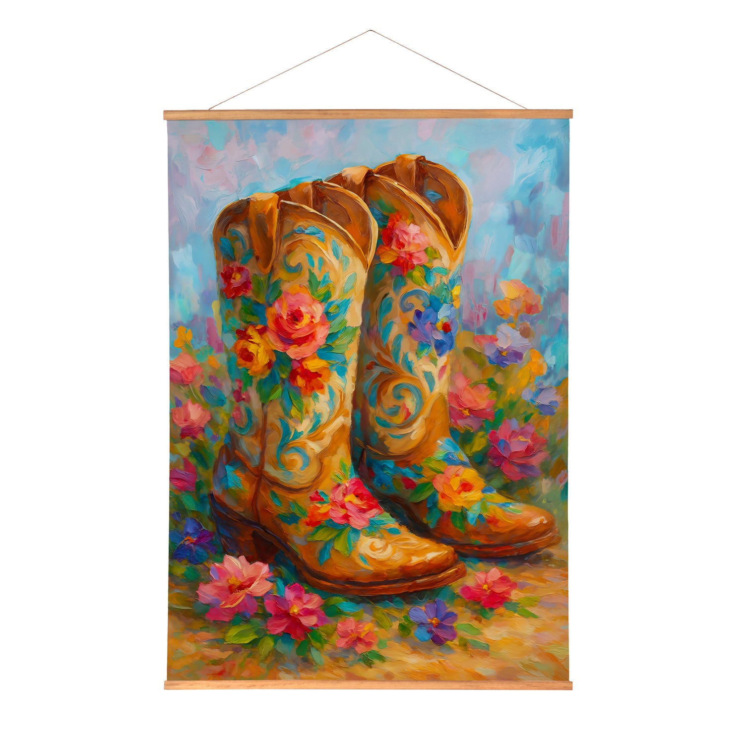 - This Hillside Pasture Indoor Wall Décor Canvas Tapestry, Floral Boots pairs rustic Western charm with soft botanicals to create a distinctive statement piece for everyday display. Rendered on textile canvas with a multicolored palette, the design showcases a serene hillside pasture and a pair of floral-adorned boots, bringing texture, warmth, and personality to living rooms, entryways, and bedrooms. It offers impactful wall decor proportions while remaining easy to place within gallery walls or over consoles, and simple care keeps it looking fresh over time. With a plug-free, no-maintenance construction, this canvas tapestry integrates effortlessly into curated spaces and home decor assortments alike.