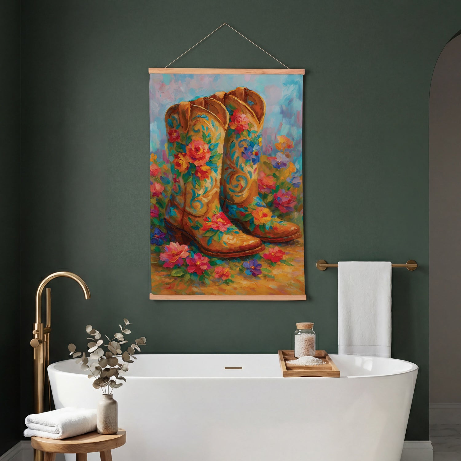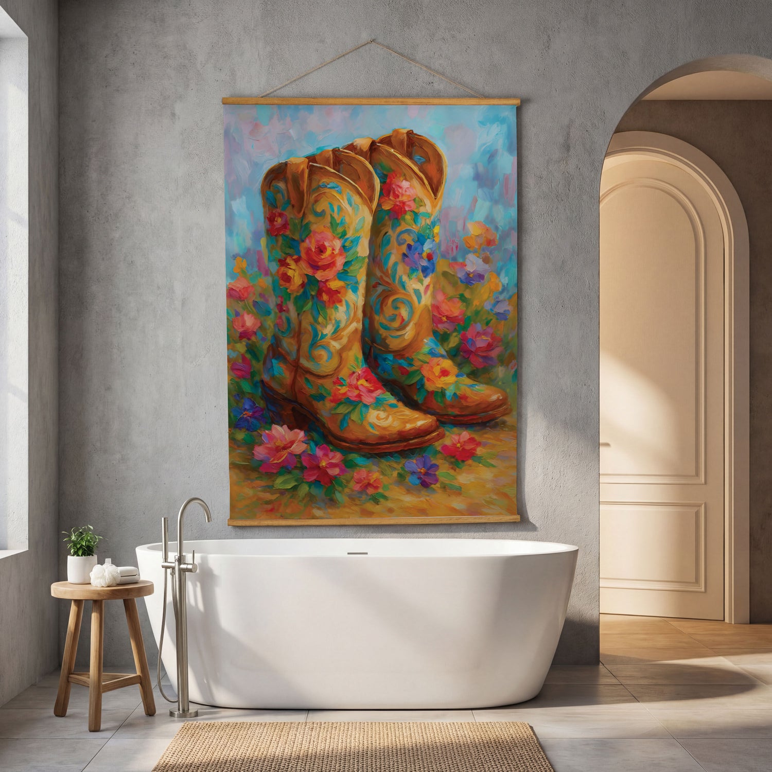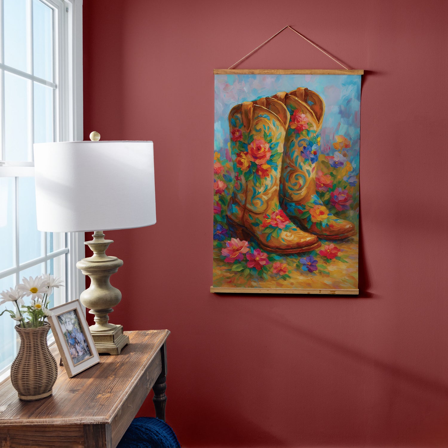 - This Hillside Pasture Indoor Wall Décor Canvas Tapestry, Floral Boots pairs rustic Western charm with soft botanicals to create a distinctive statement piece for everyday display. Rendered on textile canvas with a multicolored palette, the design showcases a serene hillside pasture and a pair of floral-adorned boots, bringing texture, warmth, and personality to living rooms, entryways, and bedrooms. It offers impactful wall decor proportions while remaining easy to place within gallery walls or over consoles, and simple care keeps it looking fresh over time. With a plug-free, no-maintenance construction, this canvas tapestry integrates effortlessly into curated spaces and home decor assortments alike.